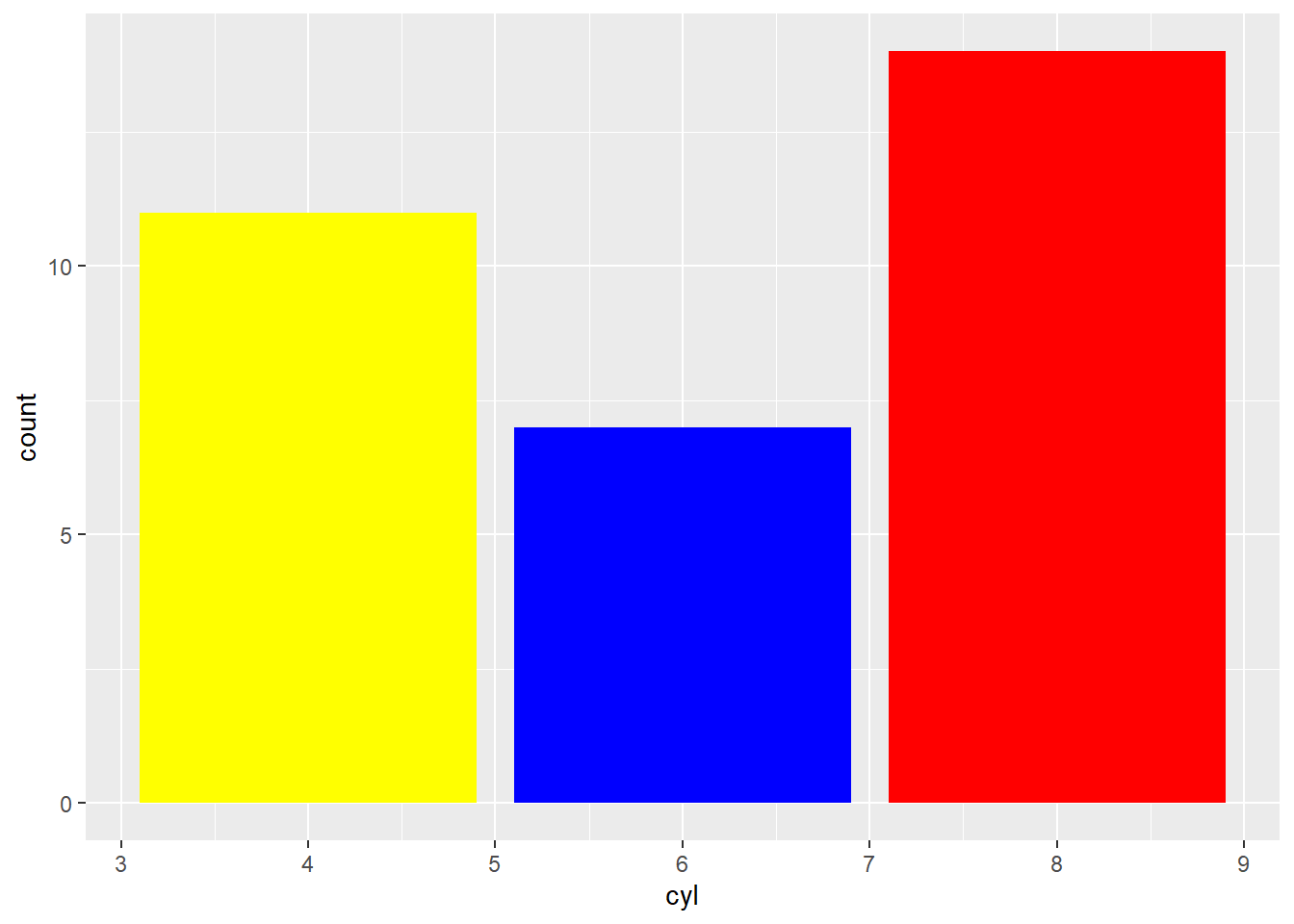 ggplot(mtcars,aes(x=cyl))+geom_bar(fill=c("yellow","blue","red"))