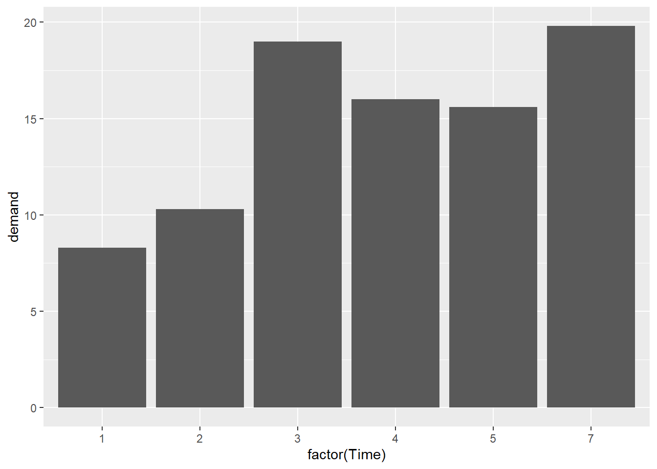 ggplot(BOD, aes(x=factor(Time), y=demand)) + geom_bar(stat="identity")# Convert Time to a discrete (categorical) variable with factor()