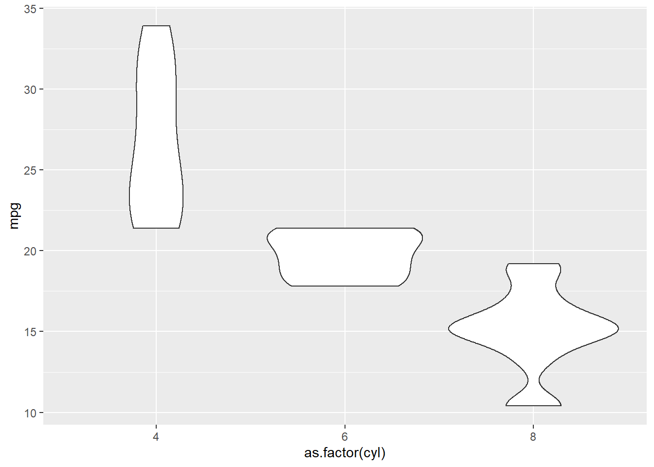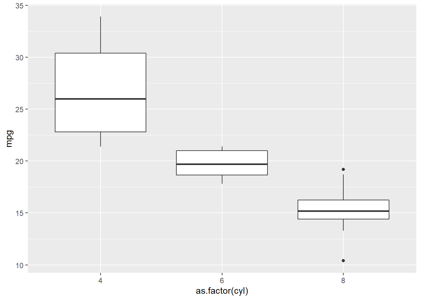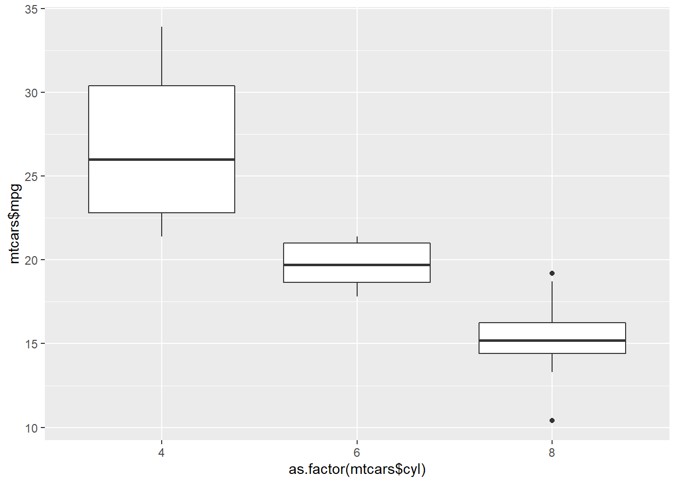 ggplot(mtcars, aes(x=as.factor(cyl), y=mpg)) + geom_boxplot( )