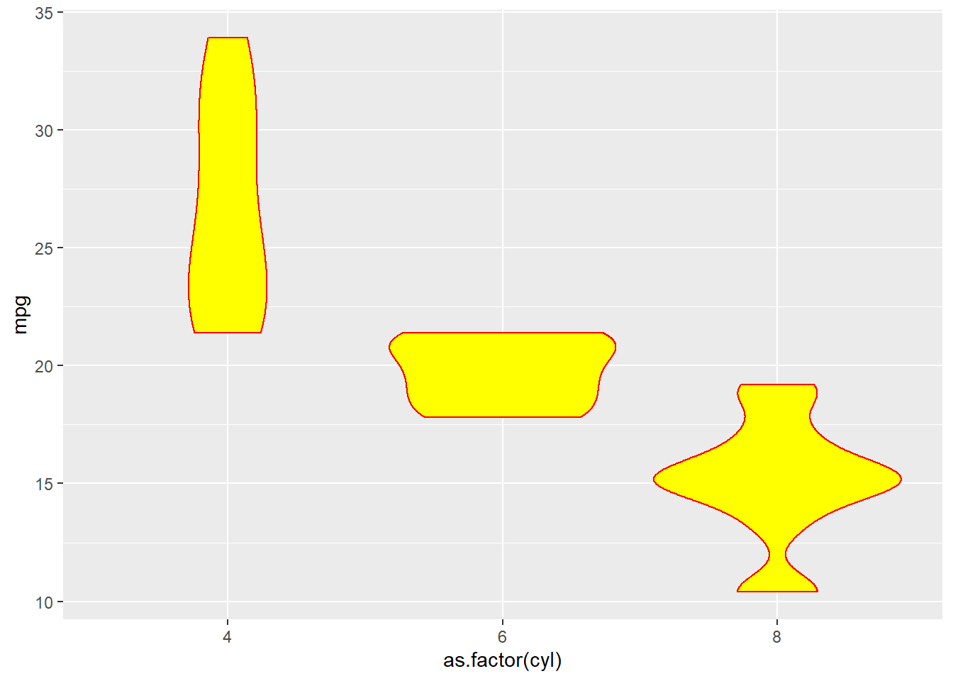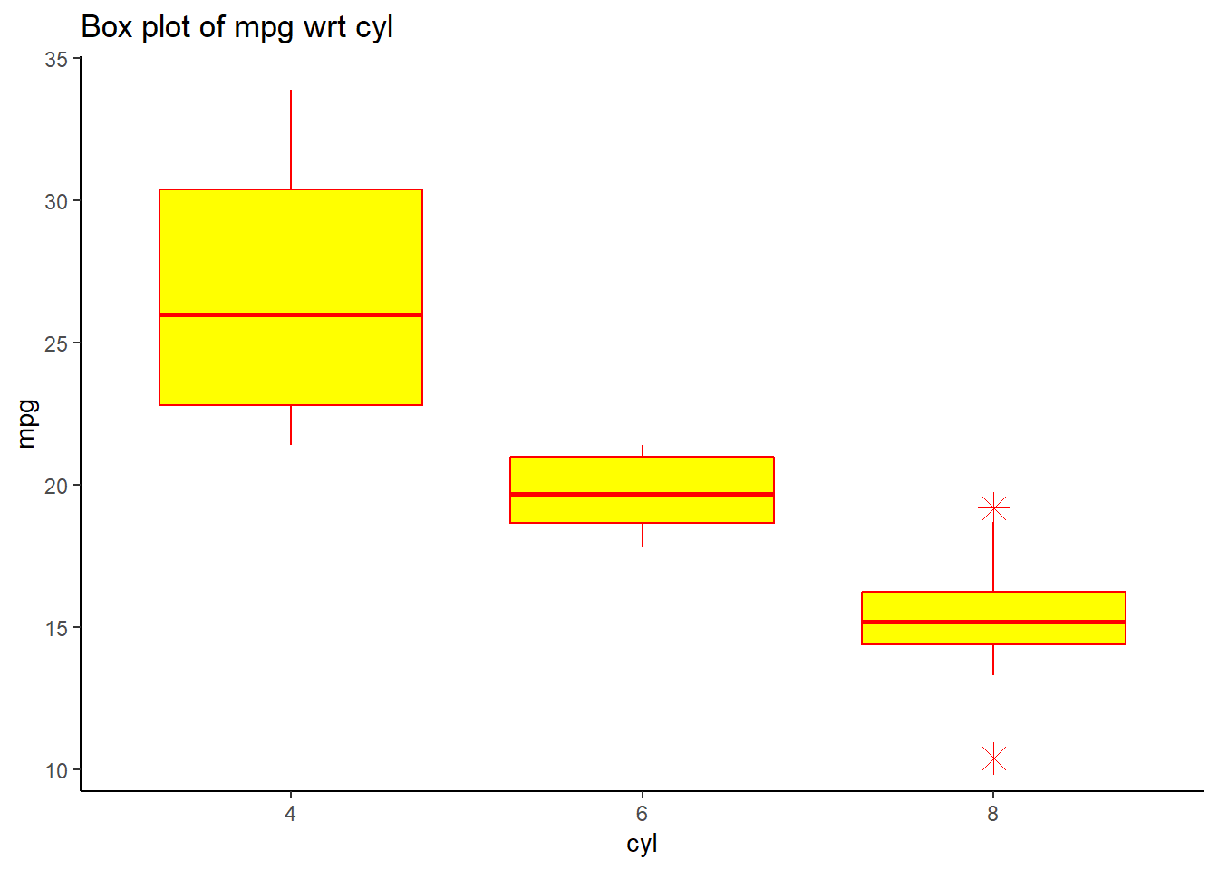 ggplot(mtcars, aes(x=as.factor(cyl), y=mpg)) + geom_boxplot(outlier.colour="red", outlier.shape=8,outlier.size=4,fill="yellow",colour="red")+