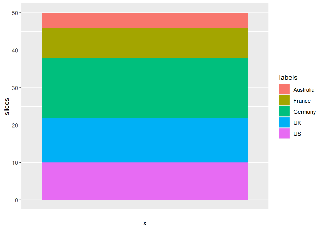 df<-data.frame(slices=c(10, 12,4, 16, 8),labels=c("US", "UK", "Australia", "Germany", "France"))
