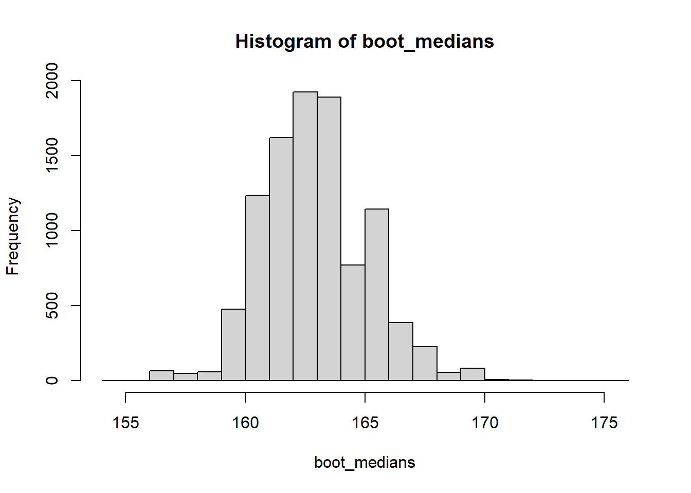median(height) + c(-1.96 * se, 1.96 * se)[1] 158.6161 167.1772
