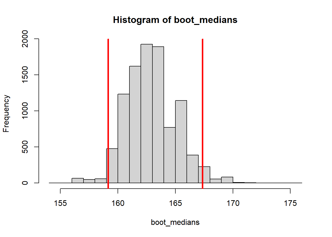 abline(v = quantile(boot_medians, c(0.025, 0.975)),