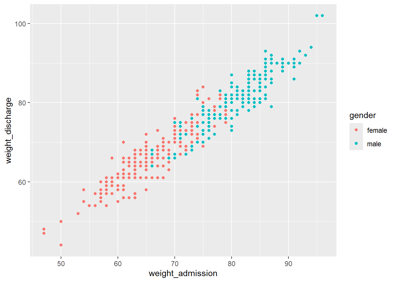 my_plot + geom_point(aes(x = weight_admission, y = weight_discharge, color = gender)) +