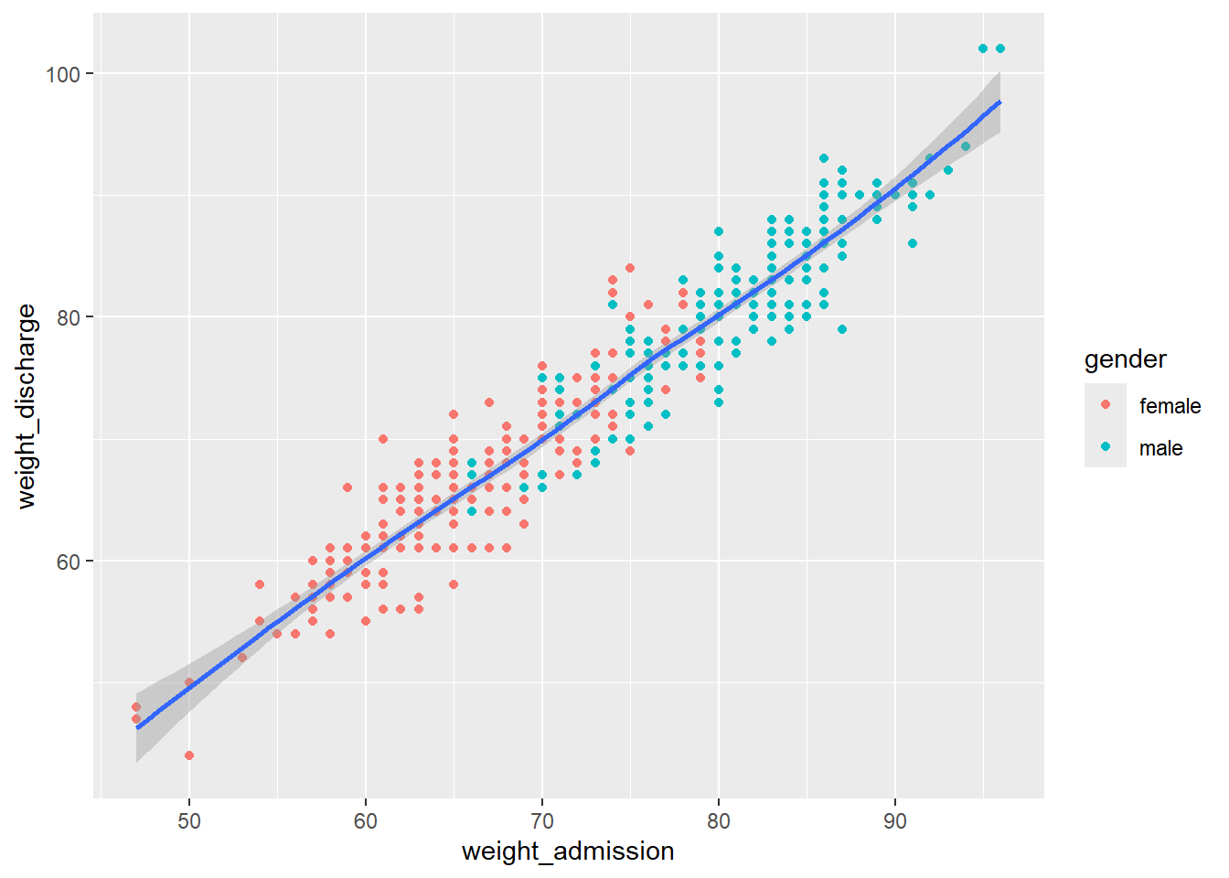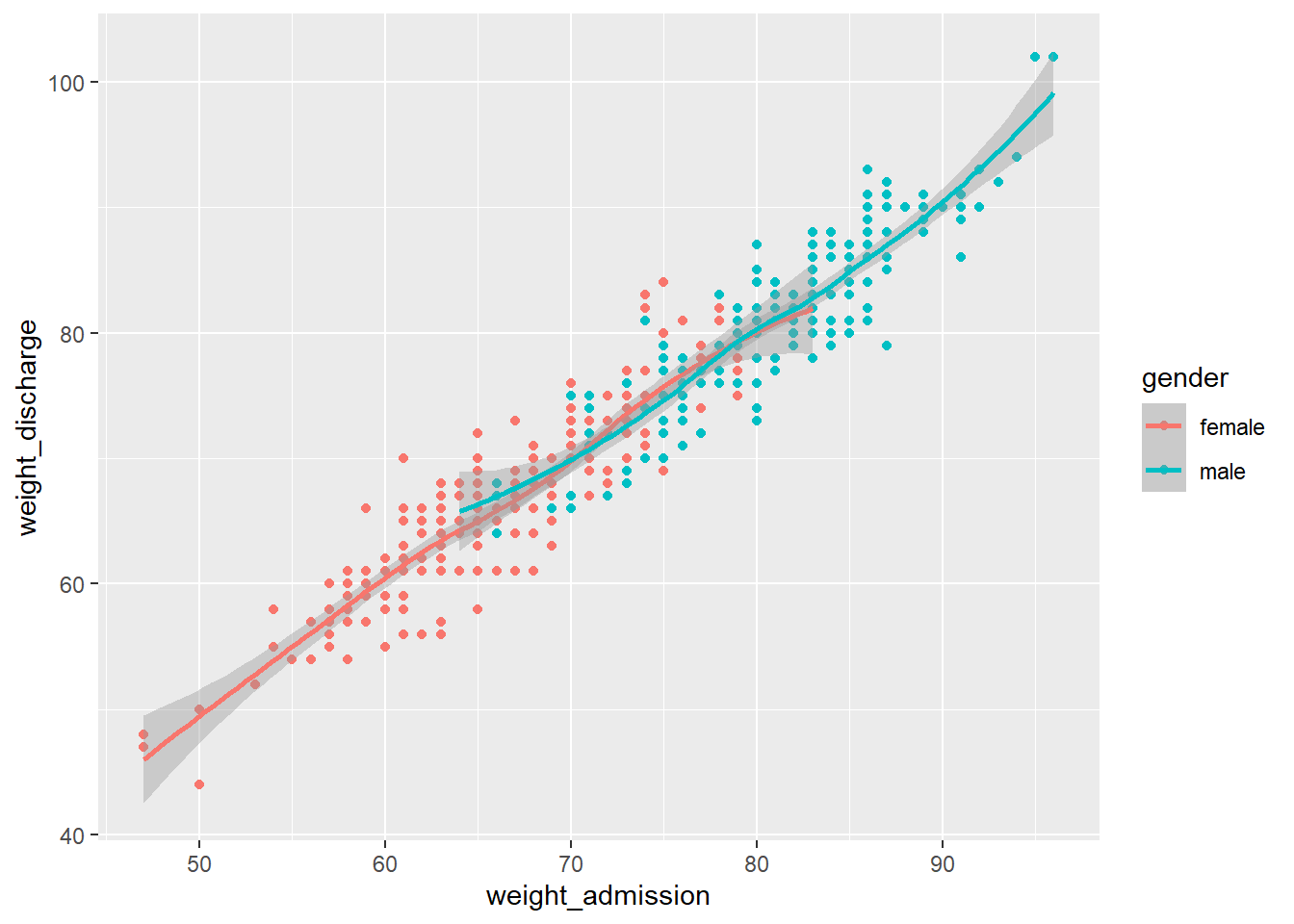 geom_smooth(aes(x = weight_admission, y = weight_discharge, color = gender))
