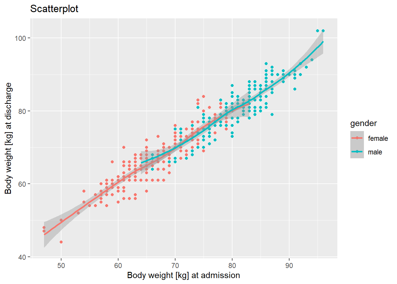 my_plot2 <- ggplot(data=d, aes(x = weight_admission, y = weight_discharge, color = gender))