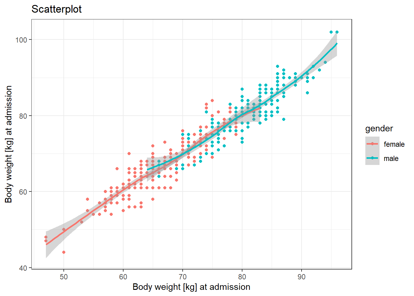 Starting with a simple graphic, we want to draw a scatterplot of the body weight at admission and at discharge. In ggplot, we build a graphics object and save it as a variable that is only actually drawn if we call it in the console. We start by laying out a white sheet and call our graphic my_plot: