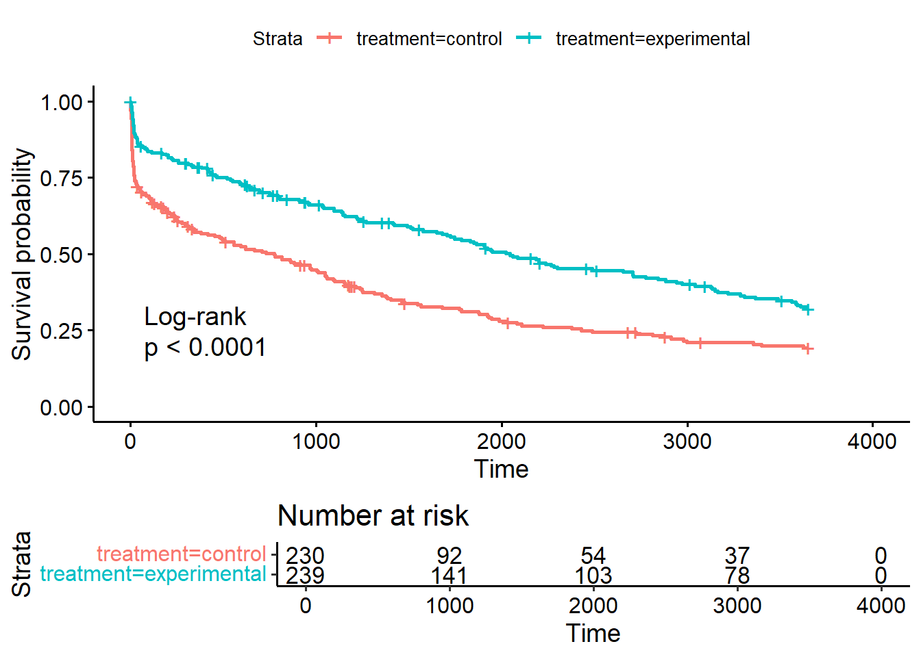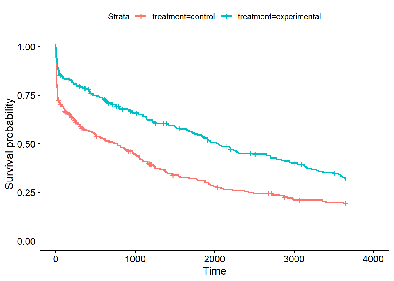 However, it is more interesting to compare the survival of different groups. Lets compare the survival of the experimental treatment group vs. the control group from the variable treatment: