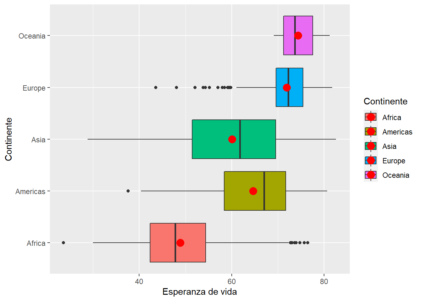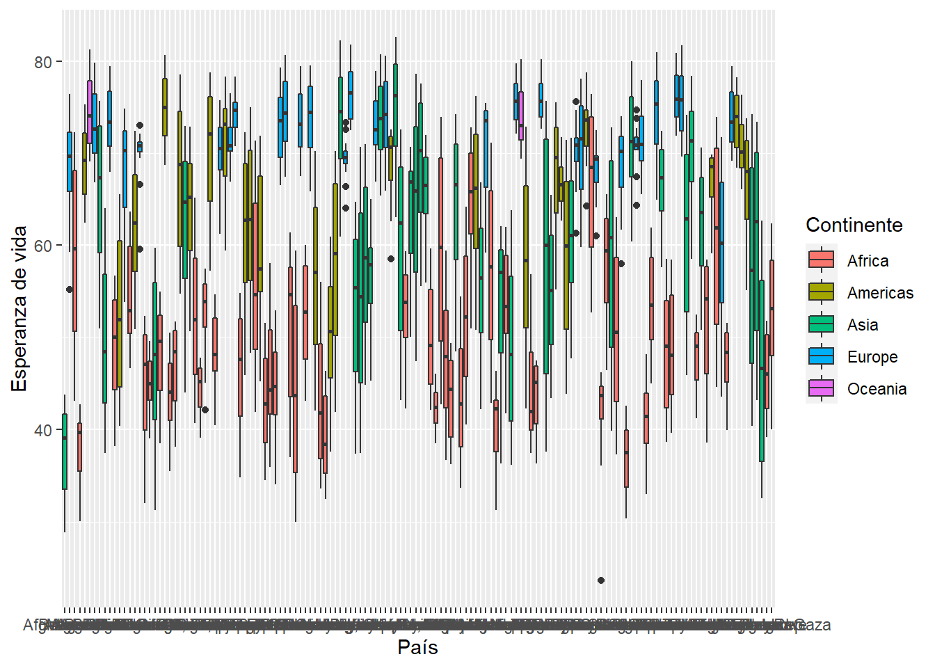 labs(x="País", y="Esperanza de vida", fill="Continente") # título, ejes y leyenda