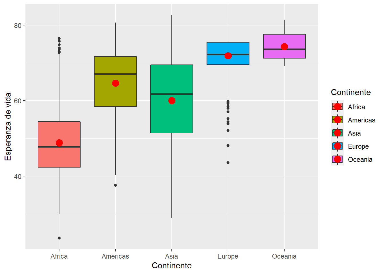 labs(x="Continente", y="Esperanza de vida", fill="Continente") +