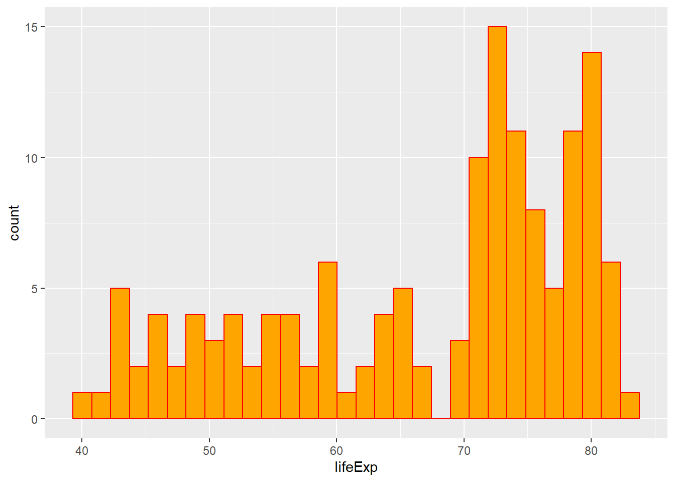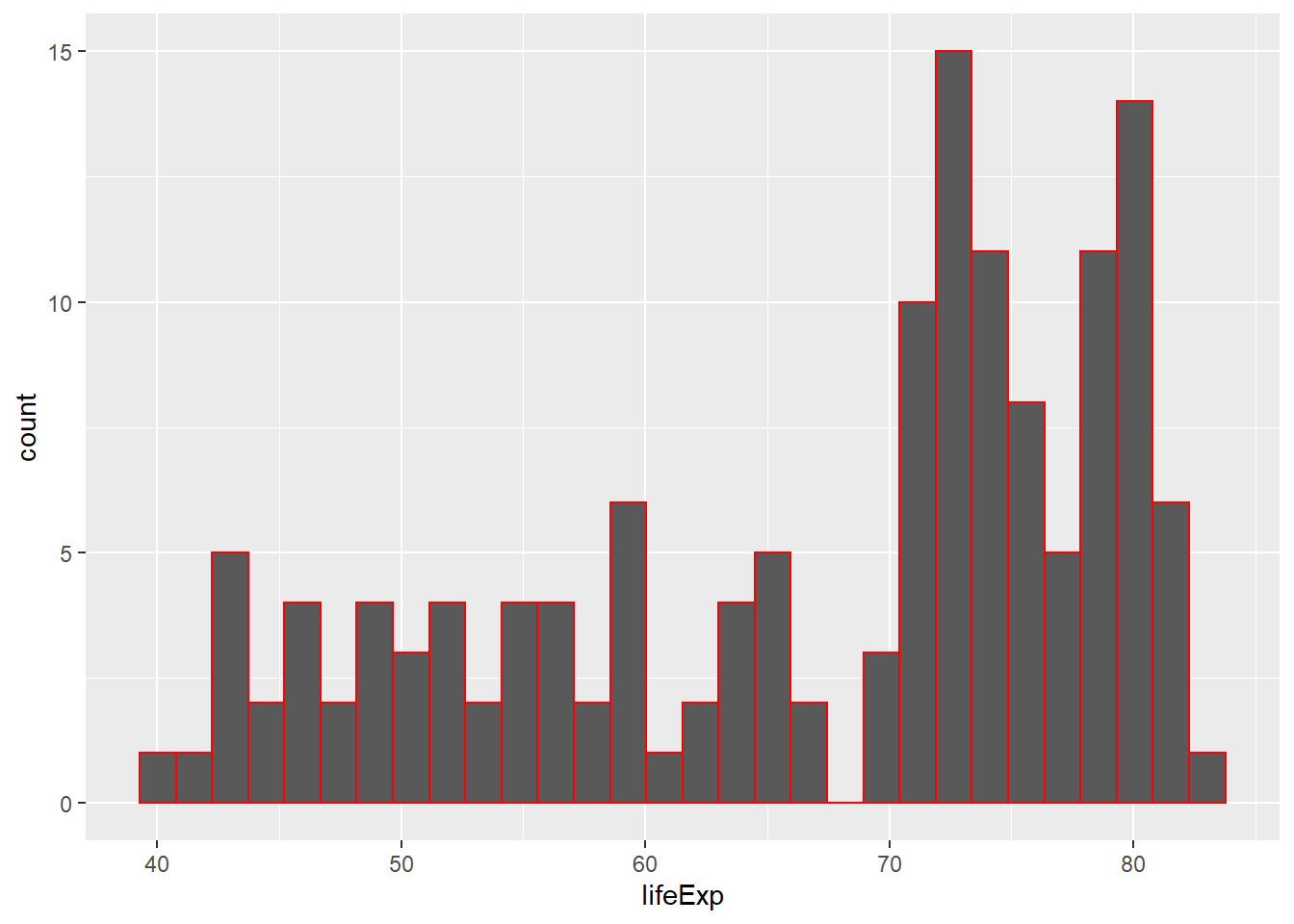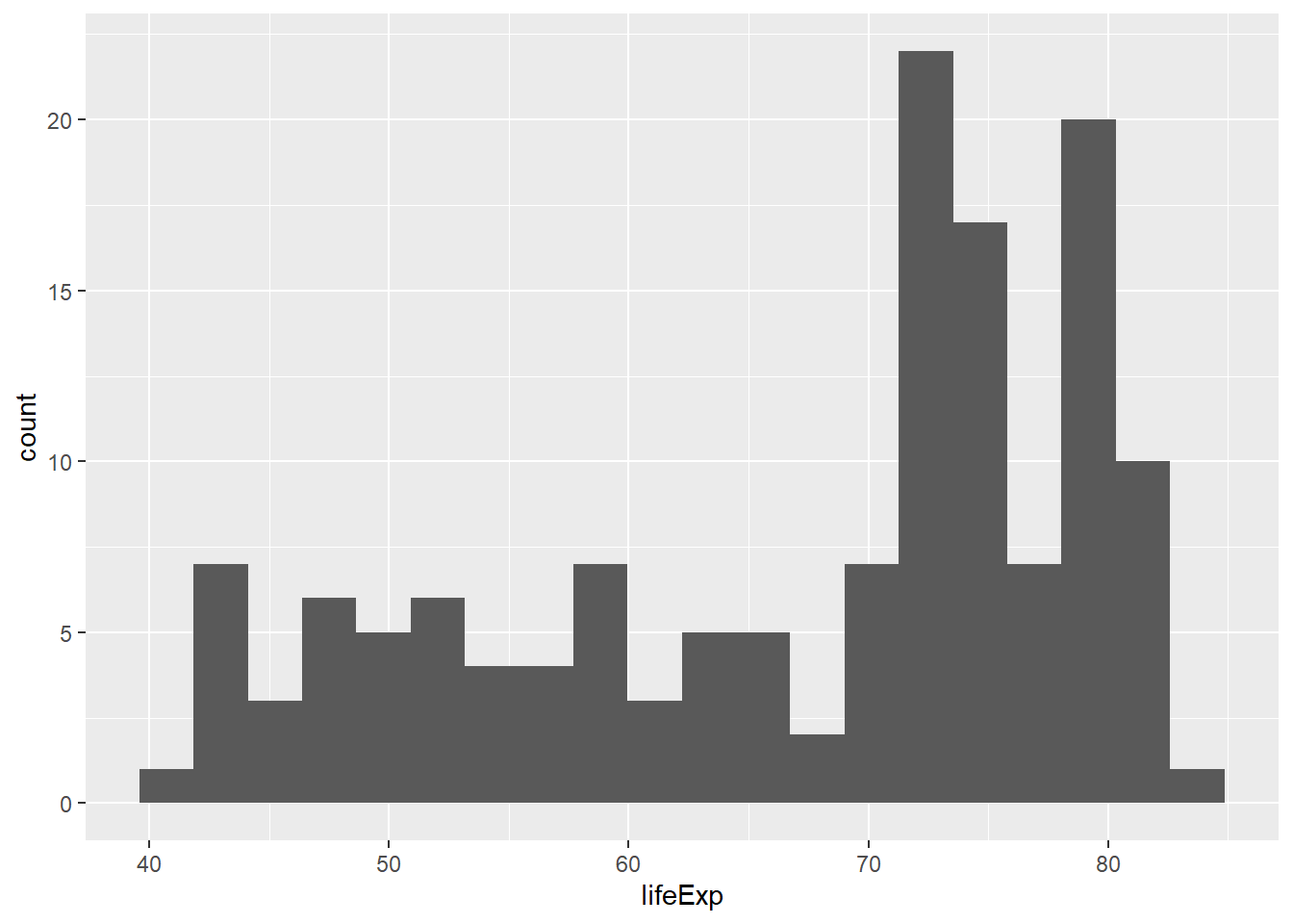 Queremos ver cómo se distribuye la esperanza de vida de los países en 2007.