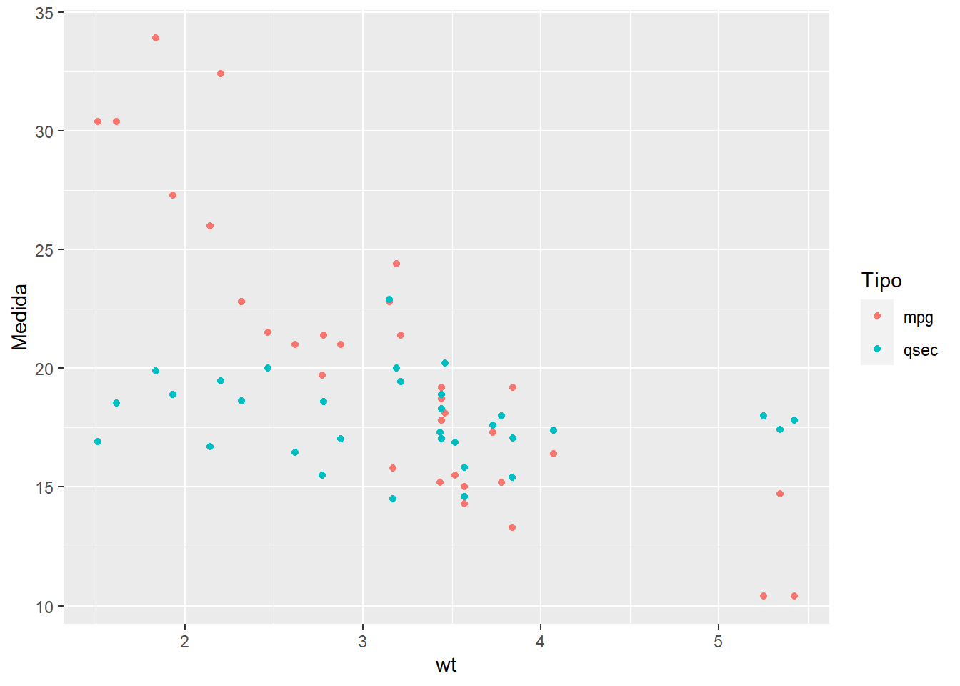 gather(mtcars,value = "Medida",key = "Tipo",mpg,qsec) %>% ggplot( aes(x=wt,y=Medida,color=Tipo)) + geom_point()