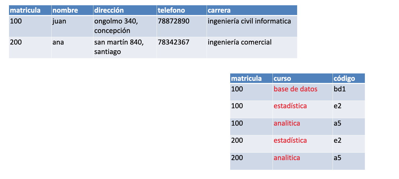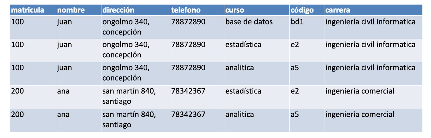 Es imperativo mantener la unicidad de los valores de los atributos/columnas. En que si bien la solución inicial puede ser duplicar el registro/tupla para contener la información adicional, no es una medida aceptada. Otra opción aparente sería agregar curso 1 y curso 2. Al igual que lo indicado en la figura siguiente permtiría atributos en blanco o nulos.