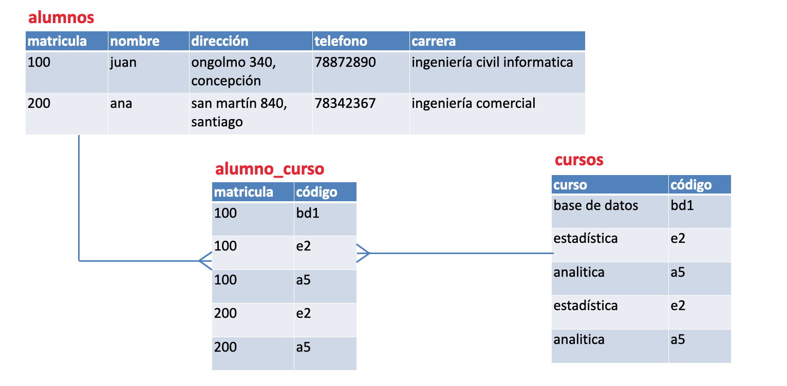Segunda Forma Normal. Cuando se estable una relación muchos a muchos (N:M) se genera una relación como tabla adicional. En este caso alumno_curso.