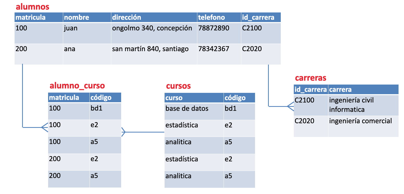 La relación alumno.matricula <- curso.matricula establece la vinculación entre los registros de cada tabla.