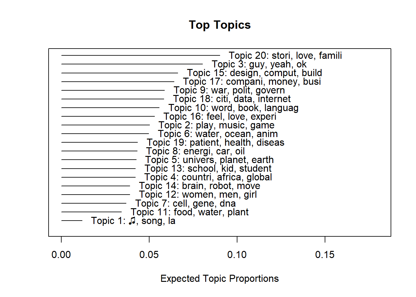 In the following, we will (only) have a look at how many topics one can identify in TED Talks (and what they are about). The authors fitted a structural topic model to a) examine how many and which topics are discussed in TED talks and b) how gender and ethnicity influence the topic prevalence (e.g., are women more likely to talk about technical topics than men?).
