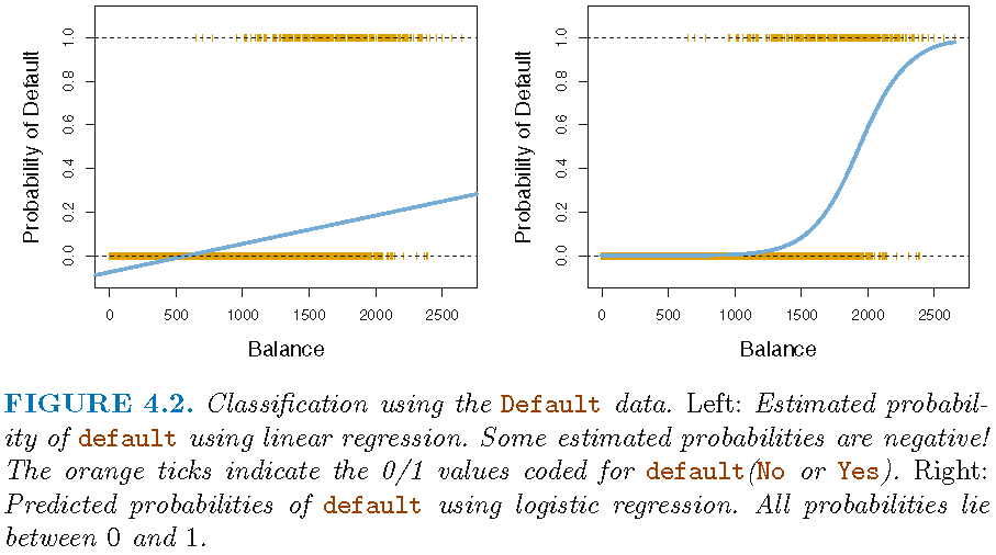 - odds: \(\frac{p(X)}{1-p(X)}=e^{\beta_{0}+\beta_{1}X}\) (range: \([0,\infty]\), the higher, the higher probability of recidivism/default)