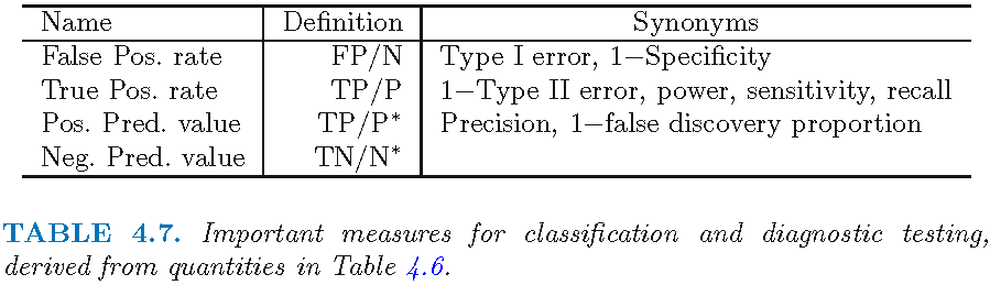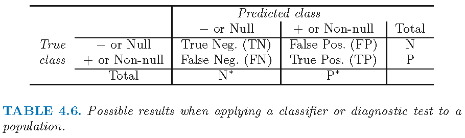 - See James et al. (2013), Fig 4.8, p. 148 where \(1 - specificity = FP/N = \text{false positives rate (FPR)}\) and \(sensitivity = TP/P = \text{true positives rate (TPR)}\)