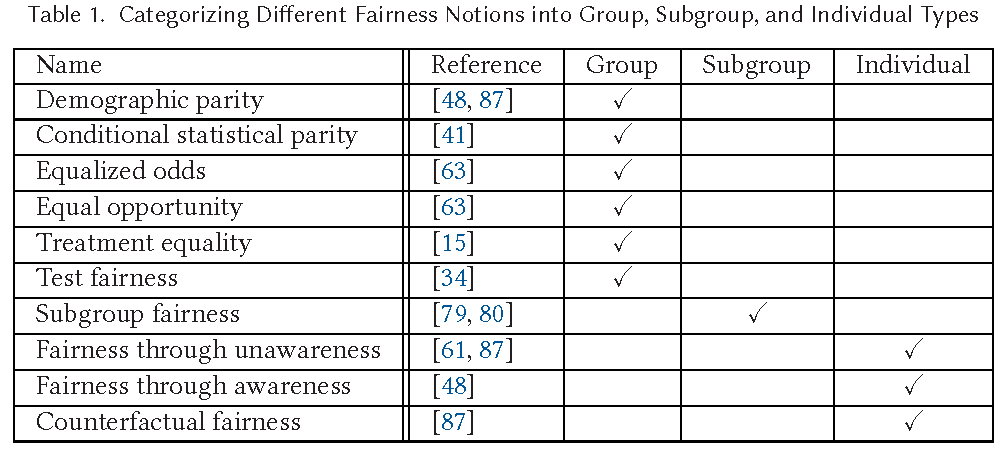 - Fairness definitions fall into different types as shown in Table in Figure 3.