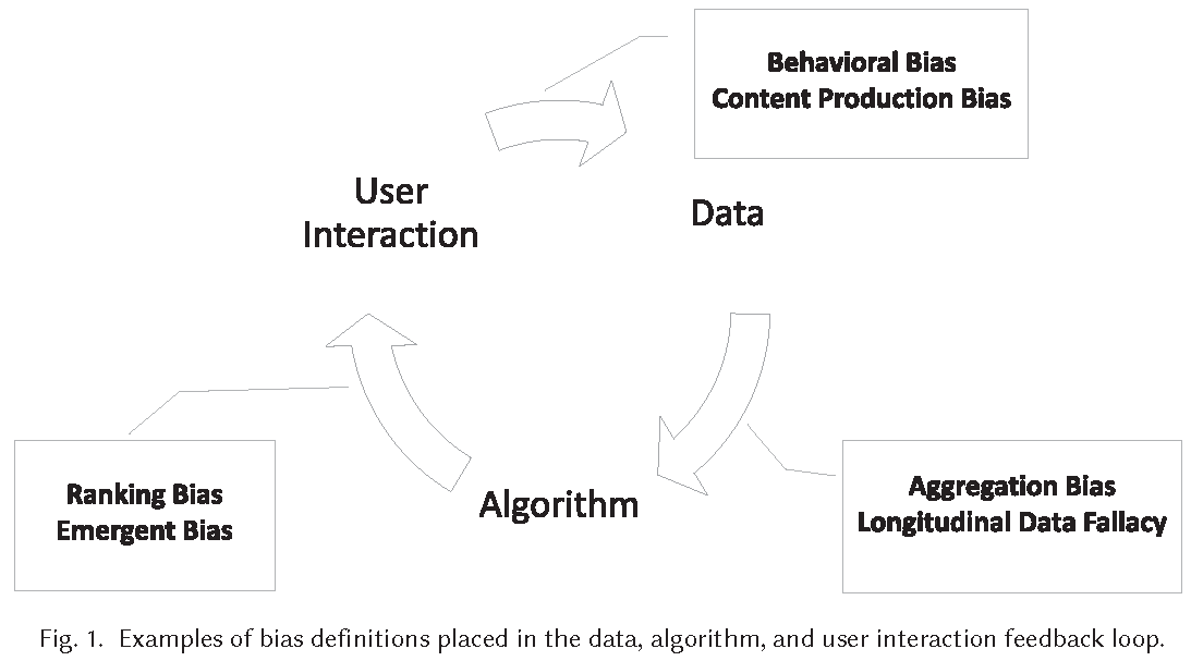 - Figure 1 visualizes the loop capturing the feedback between biases in data, algorithms, and user interaction.