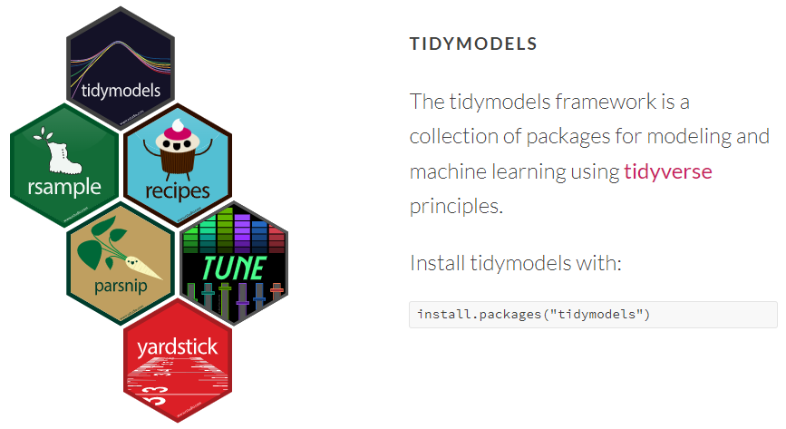 - A collection of packages for modeling and machine learning using tidyverse principles (see Barter (2020), Kuhn and Wickham (2020) and Kuhn and Silge (2022) for summaries)