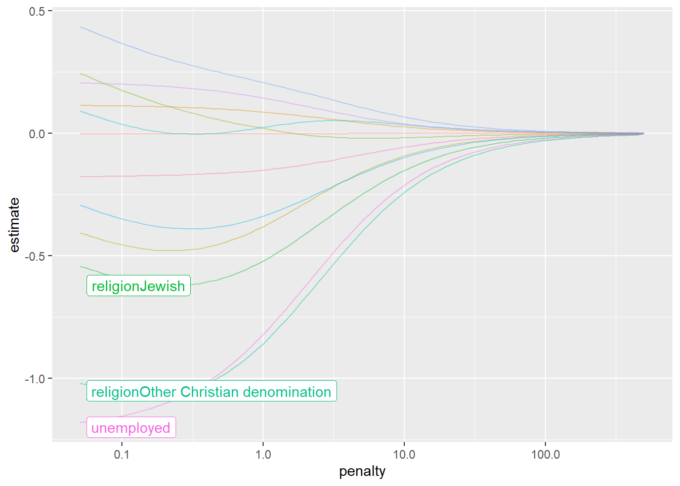 - Occasionally coefficients can increase as \(\lambda\) increases (cf. predictor “Rating”)