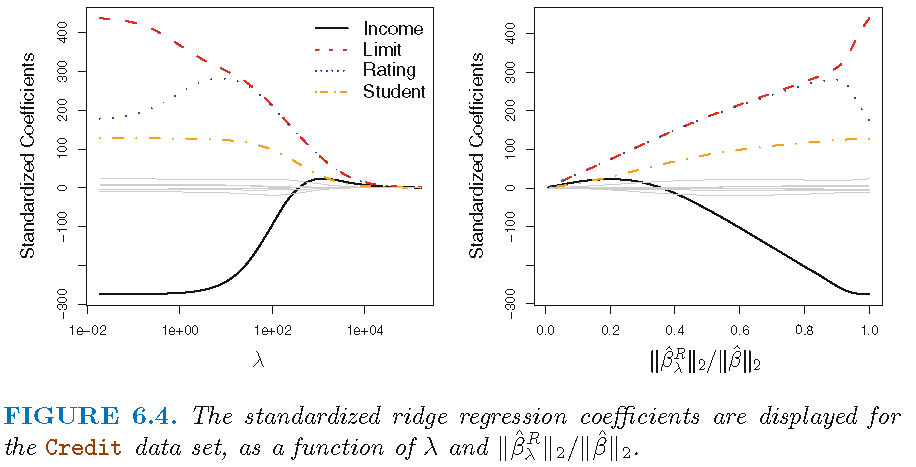 - Figure 1 displays regression coefficient estimates for the Credit data (James et al. 2013, Ch. 6.2)
