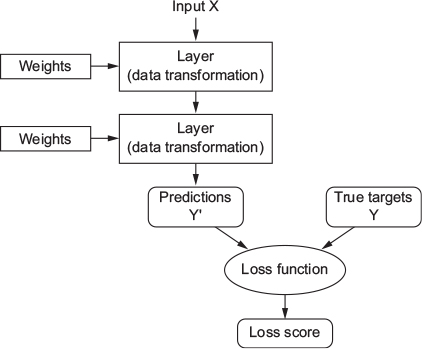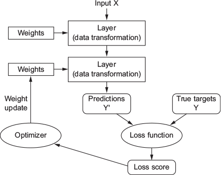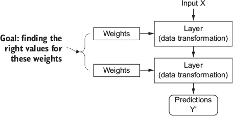 - Specification of what a layer does to its input data is stored in the layer’s weights (= a bunch of numbers) (see Figure 4)