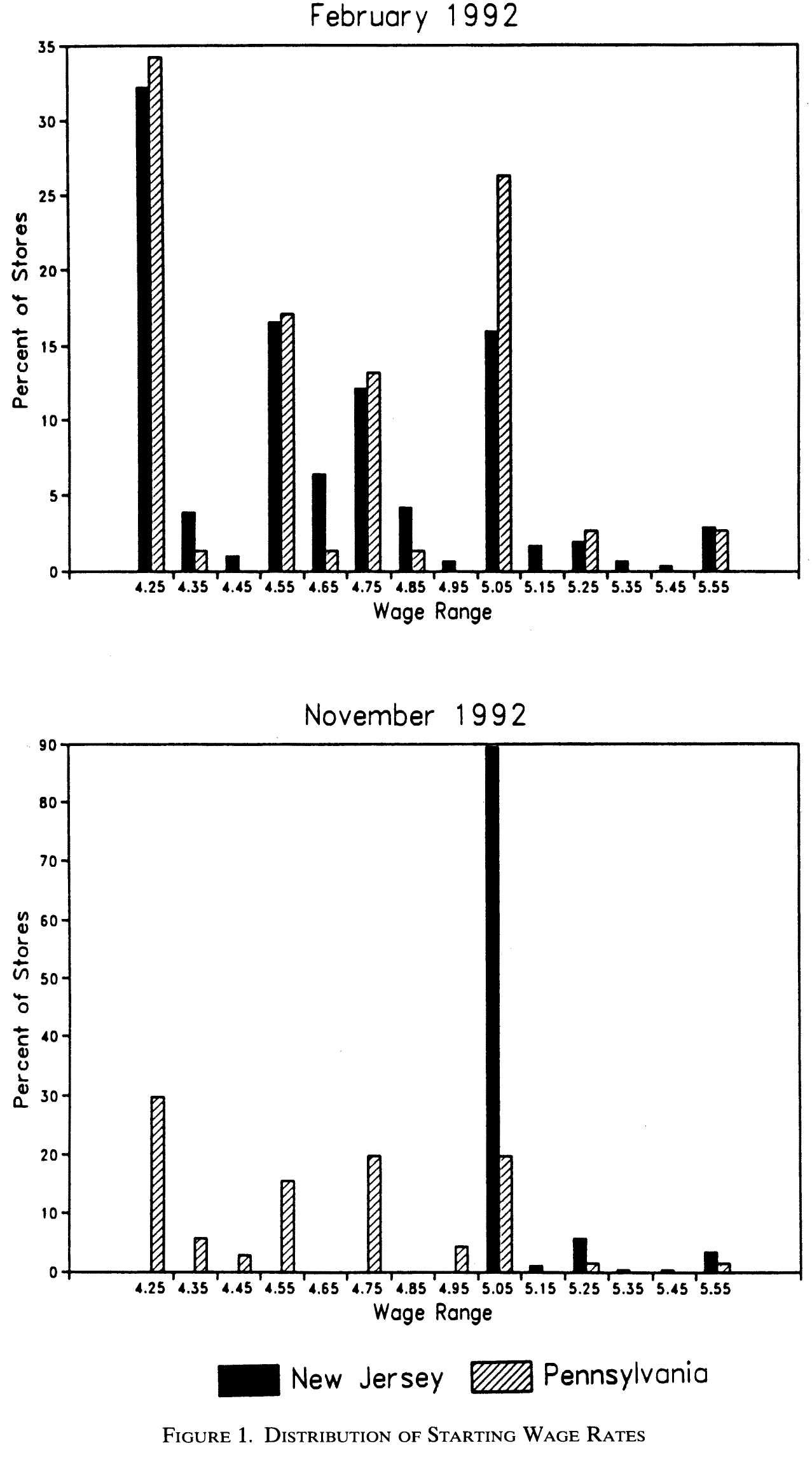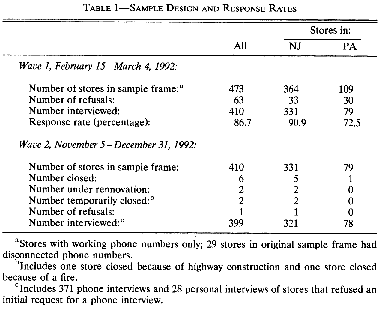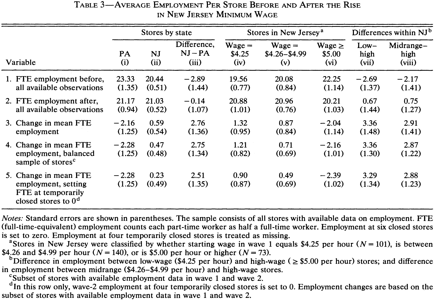 - “On April 1, 1992, New Jersey’s minimum wage rose from $4.25 to $5.05 per hour. To evaluate the impact of the law we surveyed 410 fast-food restaurants in New Jersey and eastern Pennsylvania before and after the rise. Comparisons of employment growth at stores in New Jersey and Pennsylvania (where the minimum wage was constant) provide simple estimates of the effect of the higher minimum wage. We also compare employment changes at stores in New Jersey that were initially paying high wages (above $5) to the changes at lower-wage stores. We find no indication that the rise in the minimum wage reduced employment.”