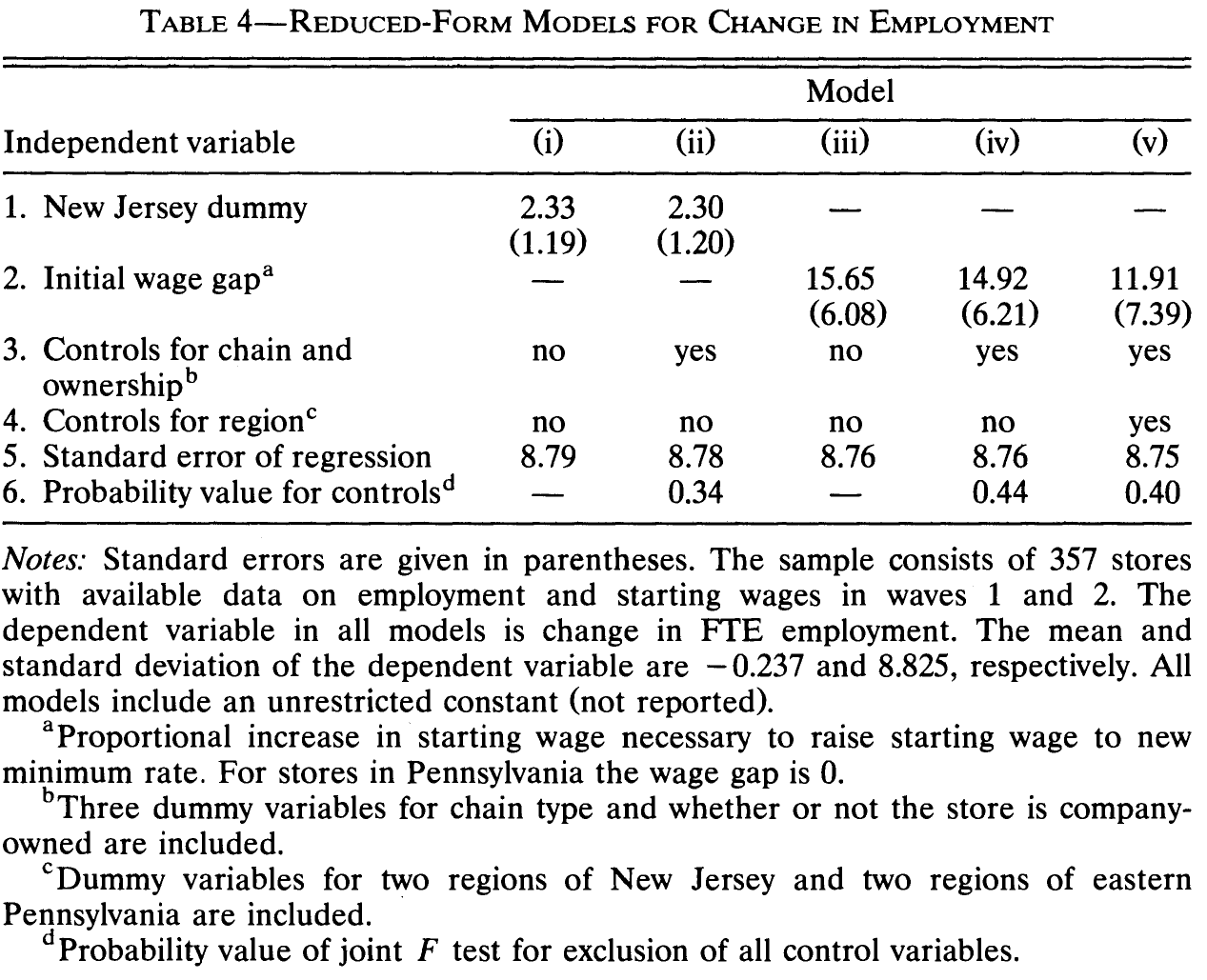 na.omit()In Table 4 (p. 780) Card & Krueger control for some covariates. Check out the table notes of the table. Remember to always provide the number of observations in such tables for any model that you provide. Here it’s rather intransparent.