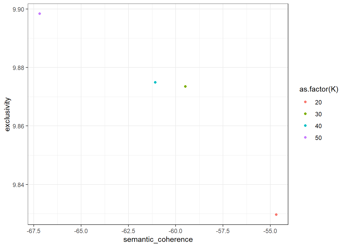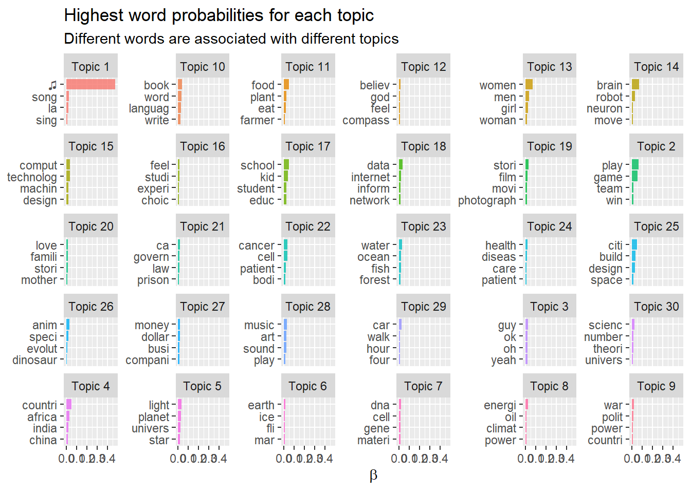 Now, using this object that contains all 2333 documents and their respective vocabulary we can calculate our first topic model. Note, that we decide to search for 20 topics (\(k\)).