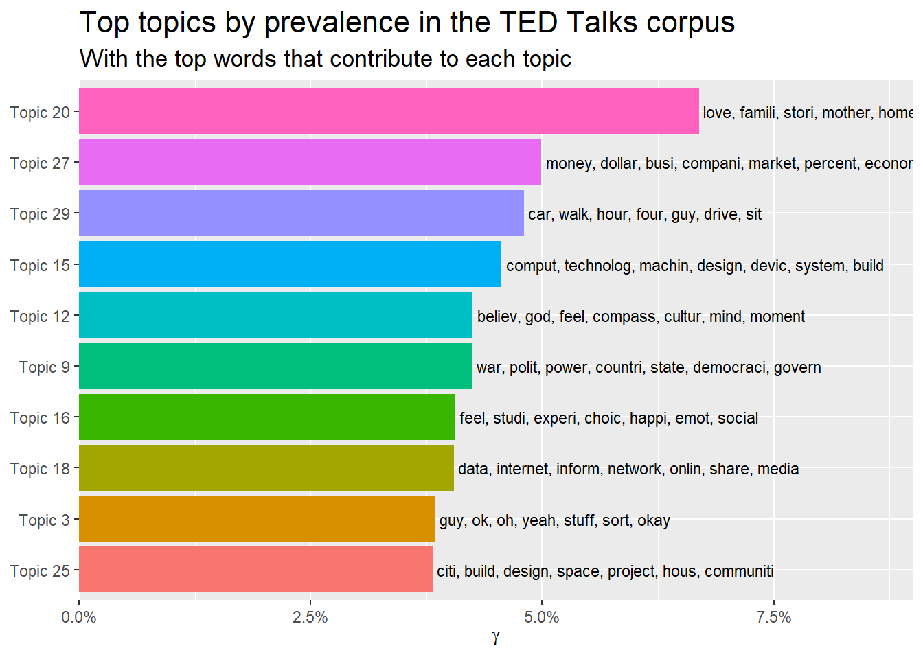 In the following, we will (only) have a look at how many topics we can identify in TED Talks (and what they are about). The authors fitted a structural topic model (STM) to a) examine how many and which topics are discussed in TED talks and b) how gender and ethnicity influence the topic prevalence (e.g., are women more likely to talk about technical topics than men?).