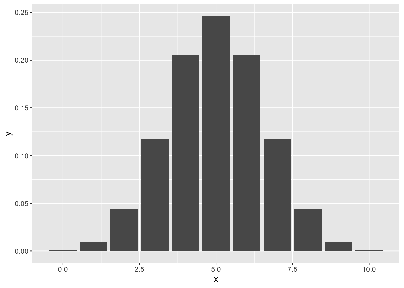 Listing 4.18: Replicate Figure 4.1: Binomial Distribution of 10 Coin Flips {tidydice}