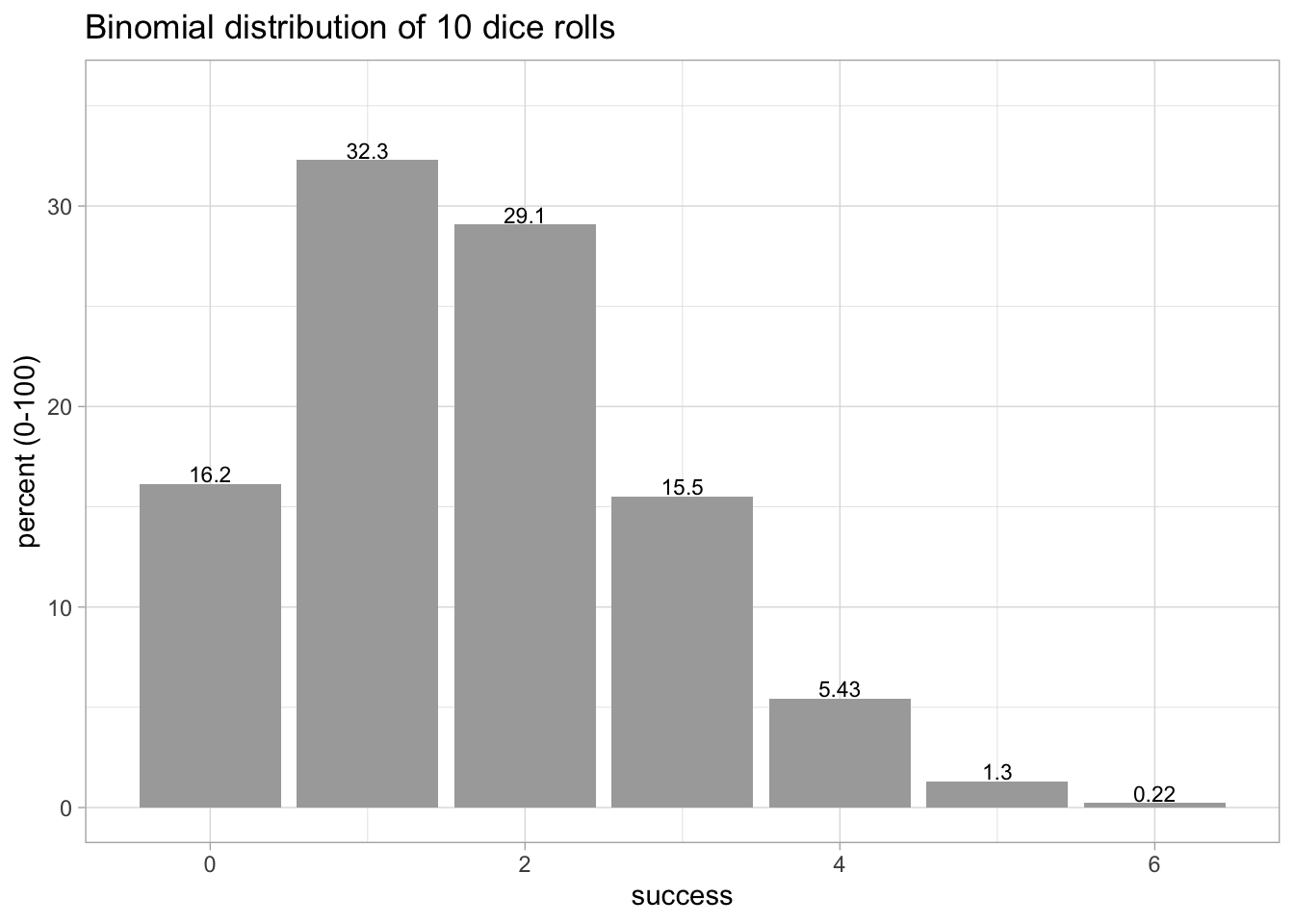 tidydice::binom_dice(times = 10, sides = 6, success = 6),