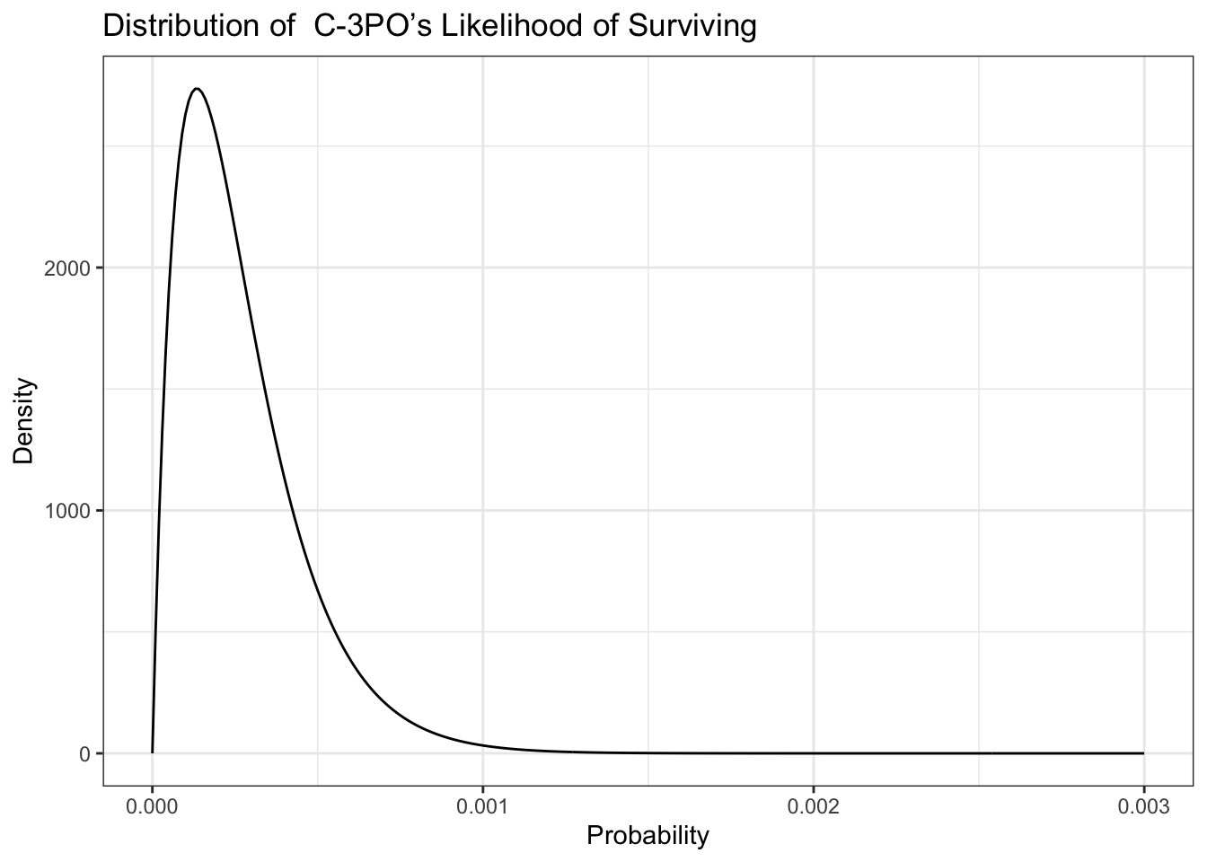Listing 9.4: Replication of Figure 9.1: Distribution of C-3PO’s Likelihood of Surviving