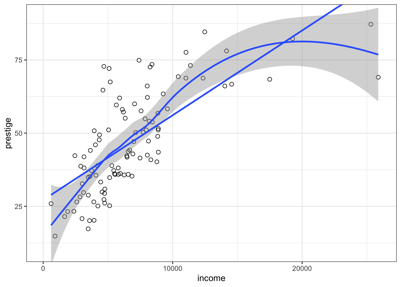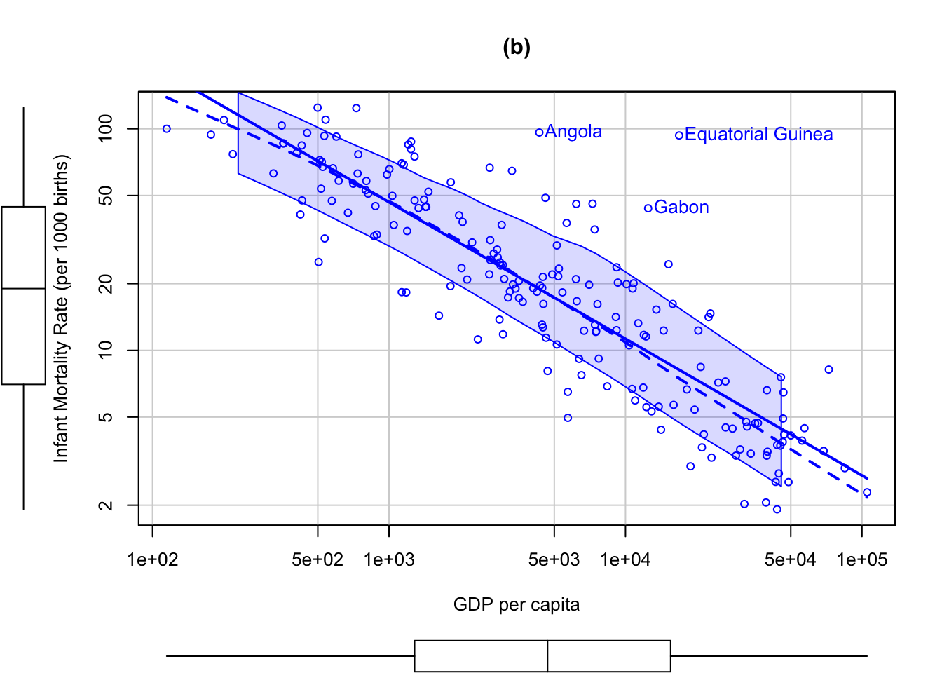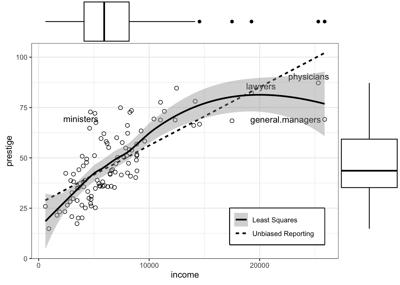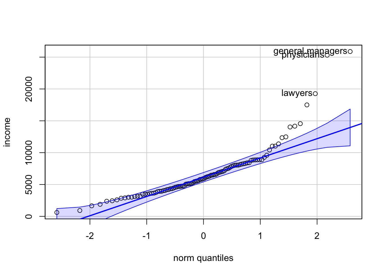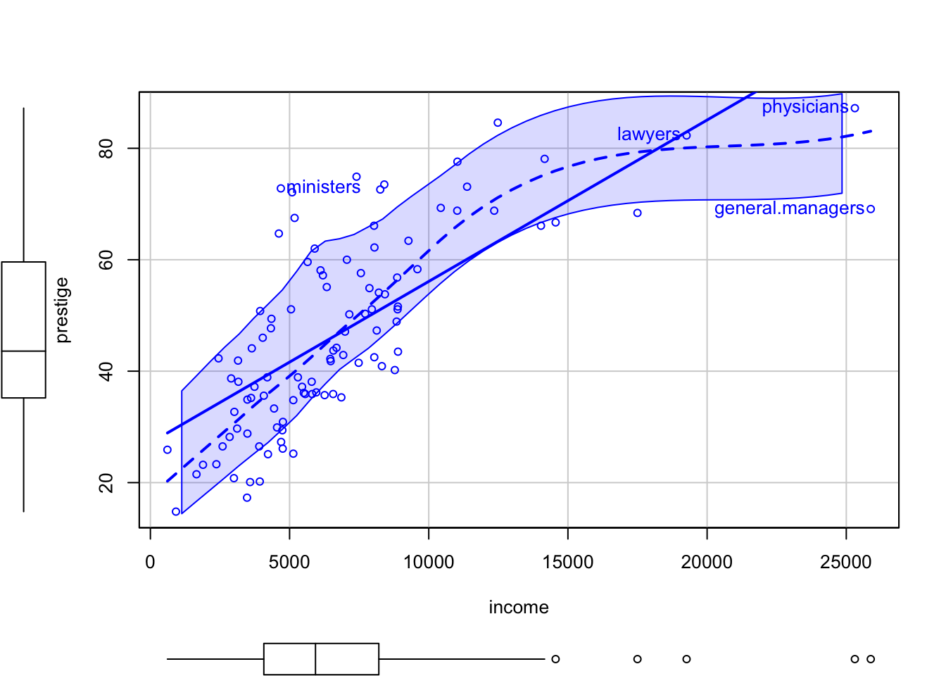 idargument, which takes the values TRUE, FALSE, or a detailed list of specifications. In most cases, the user only needs to setid = TRUEor to specify the number of points to be identified, for example,id = list(n = 5). - labels: By default, points are labeled with a data frame’s row labels or by row numbers if there are no row labels. You can use whatever point labels you like by setting labels to a character vector with the same number of elements as there are data points.