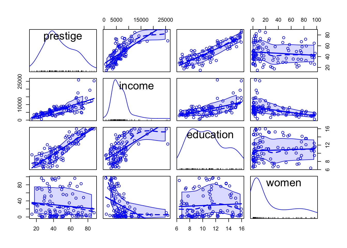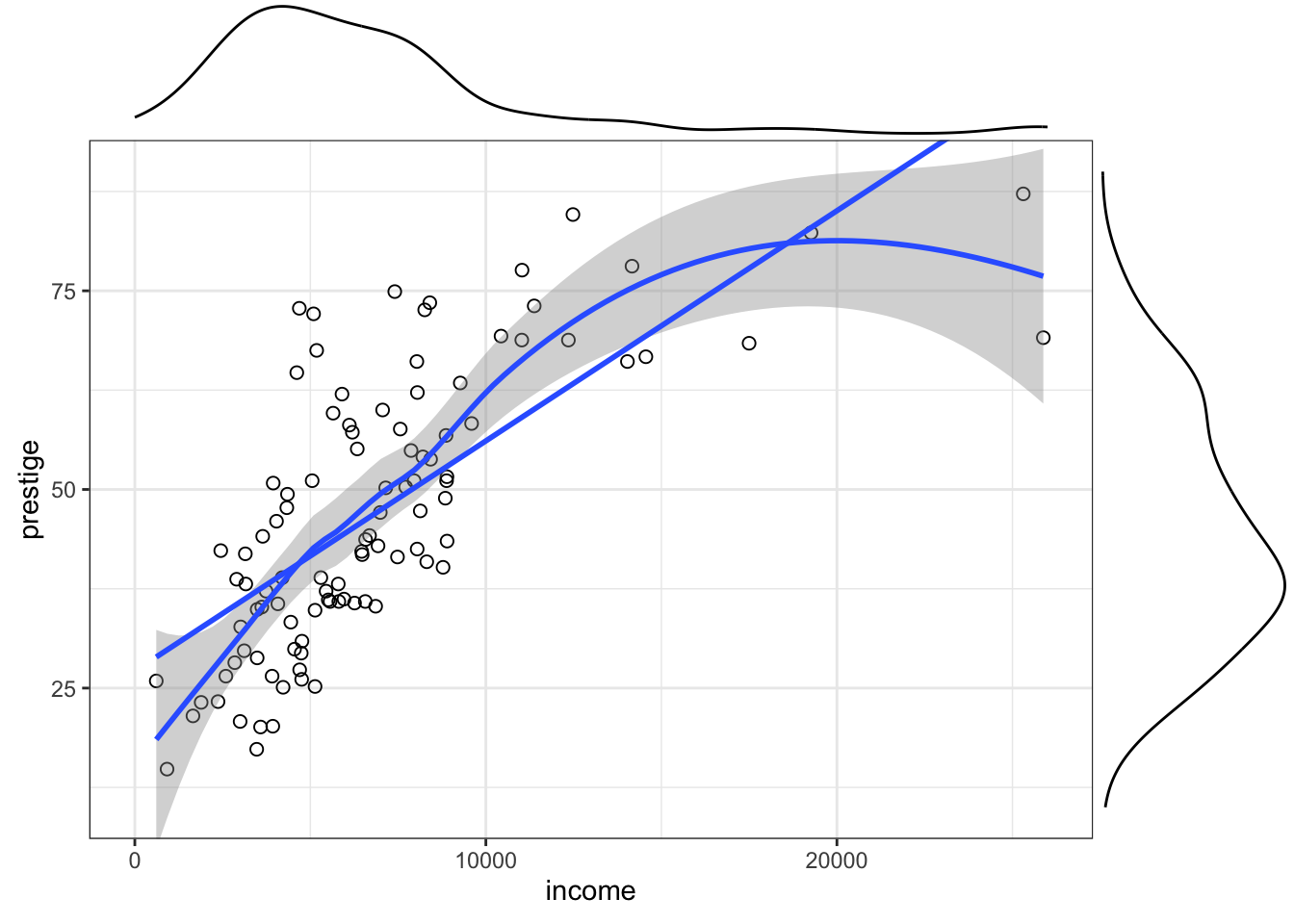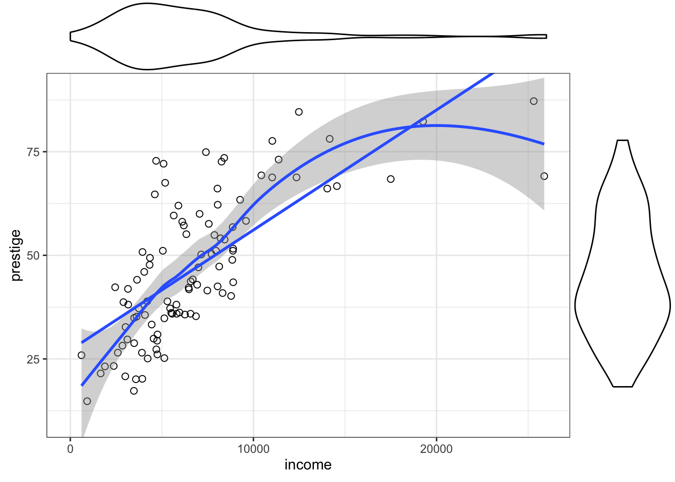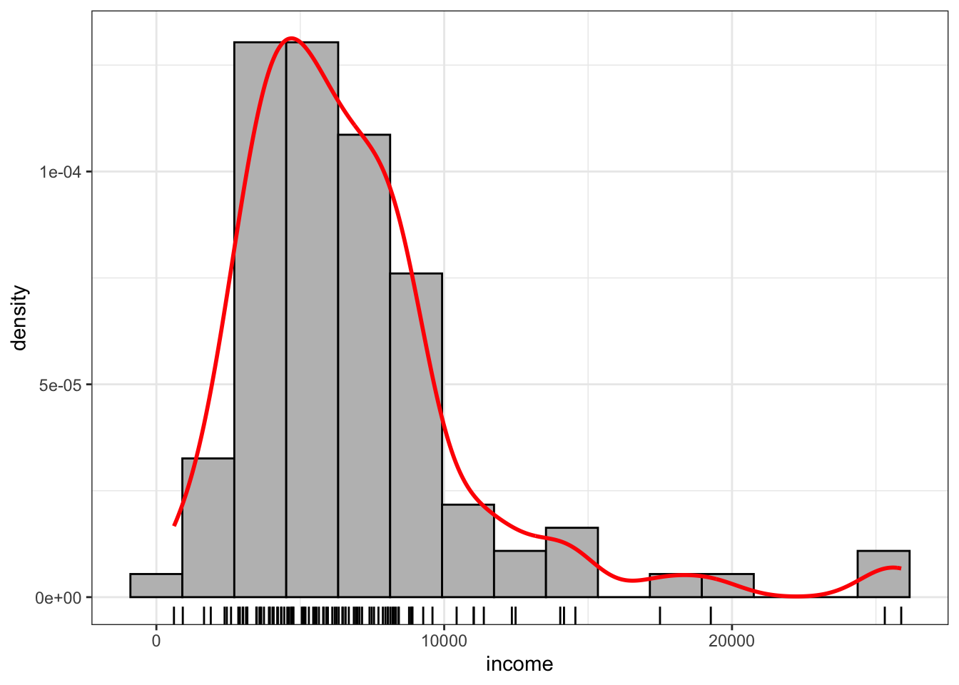Prestige data set; a density histogram of income is also shown. The rug-plot at the bottom of the graph shows the location of the income values.