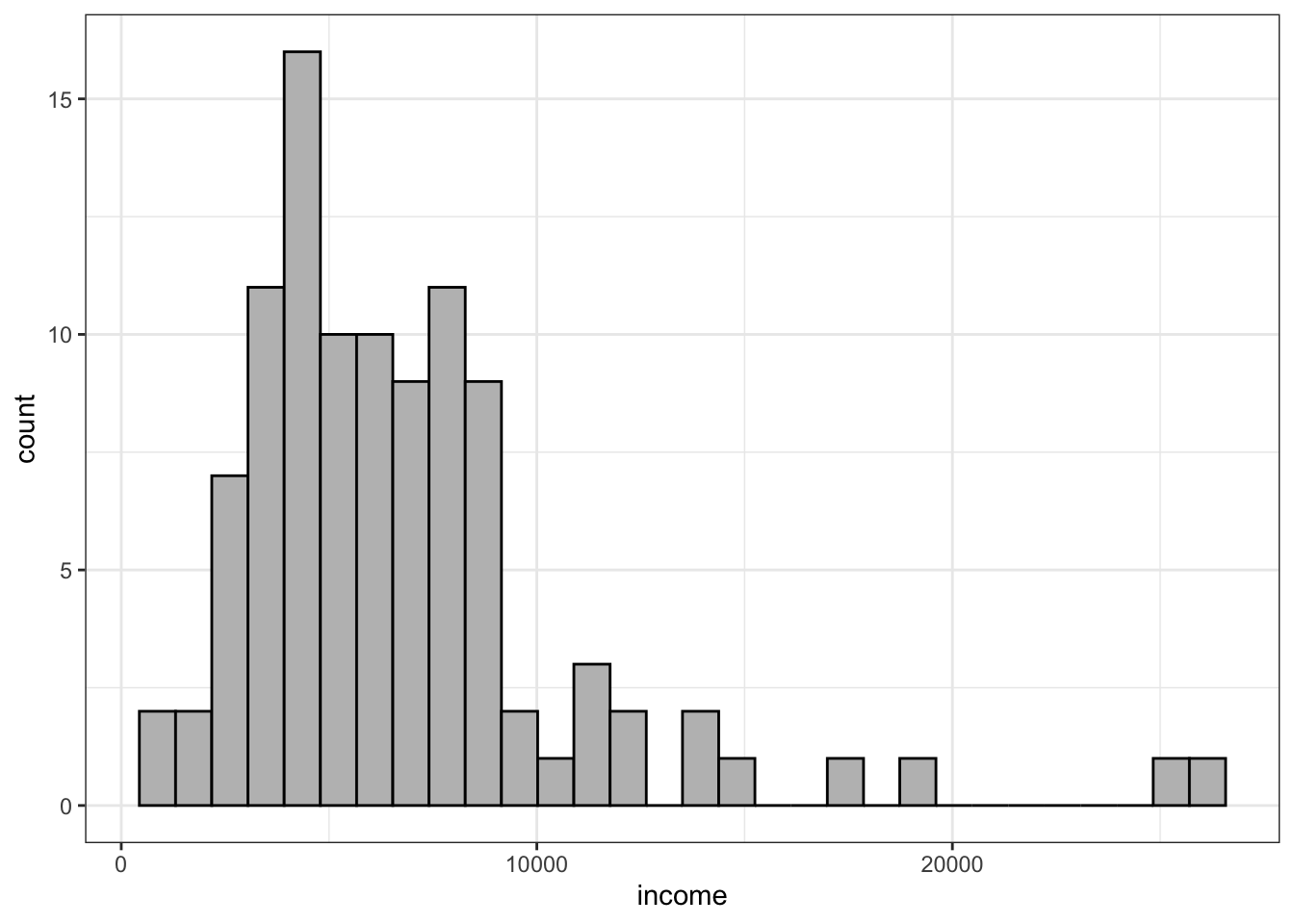 R Code 3.4 : Histogram with {ggplot2} (30 bins default)