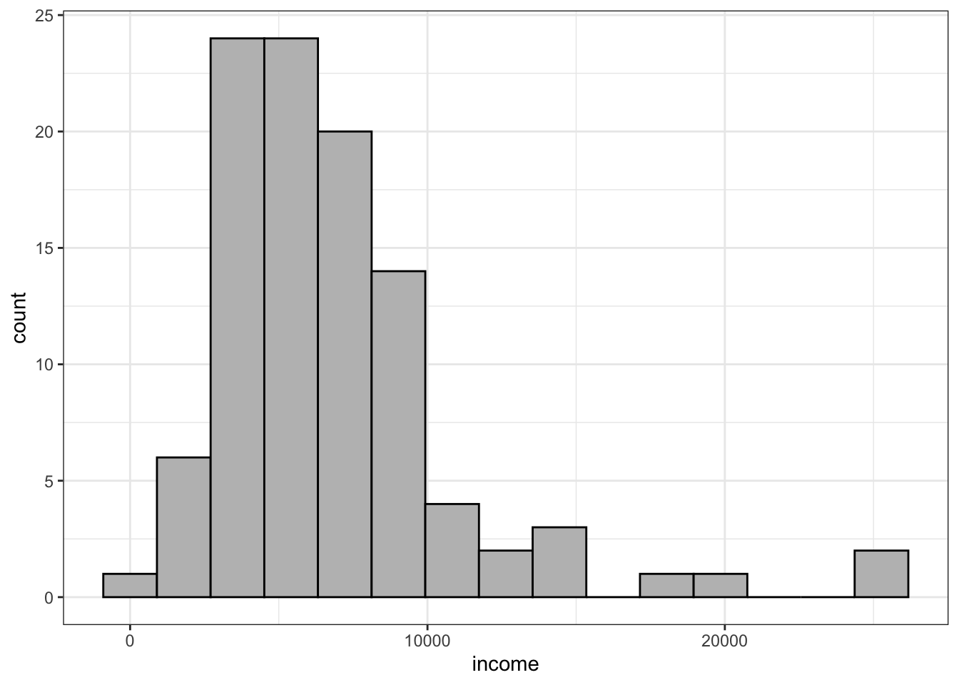 Both nonparametric density estimates and the histogram suggest a mode at around $5,000, and all three show that the distribution of income is rightskewed. The fixed-bandwidth kernel estimate has more wiggle at the right where data are sparse, and the histogram is rough in this region, while the adaptive-kernel estimator is able to smooth out the density estimate in the low-density region.