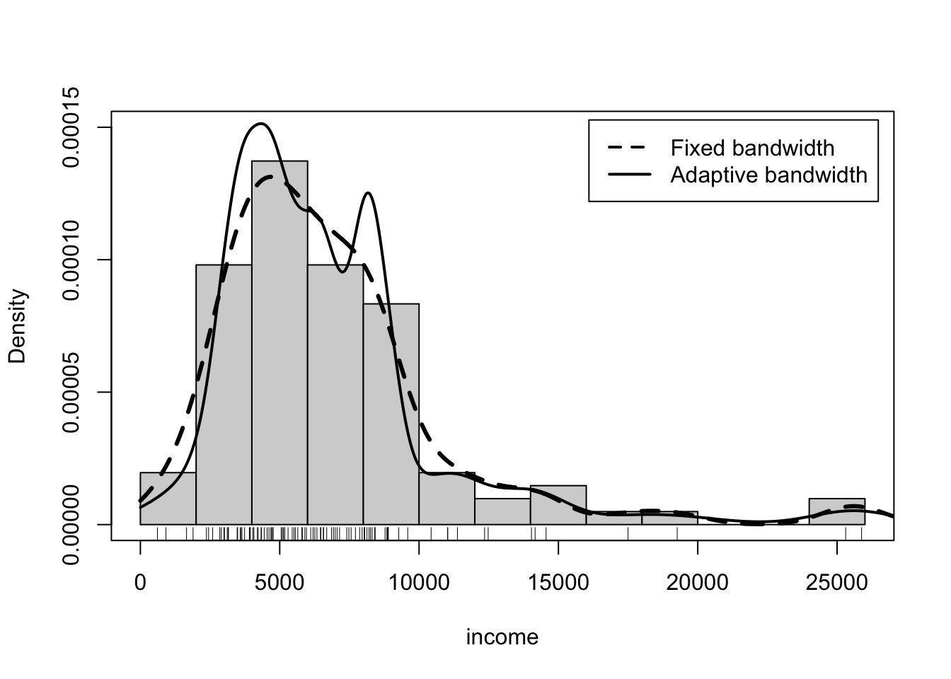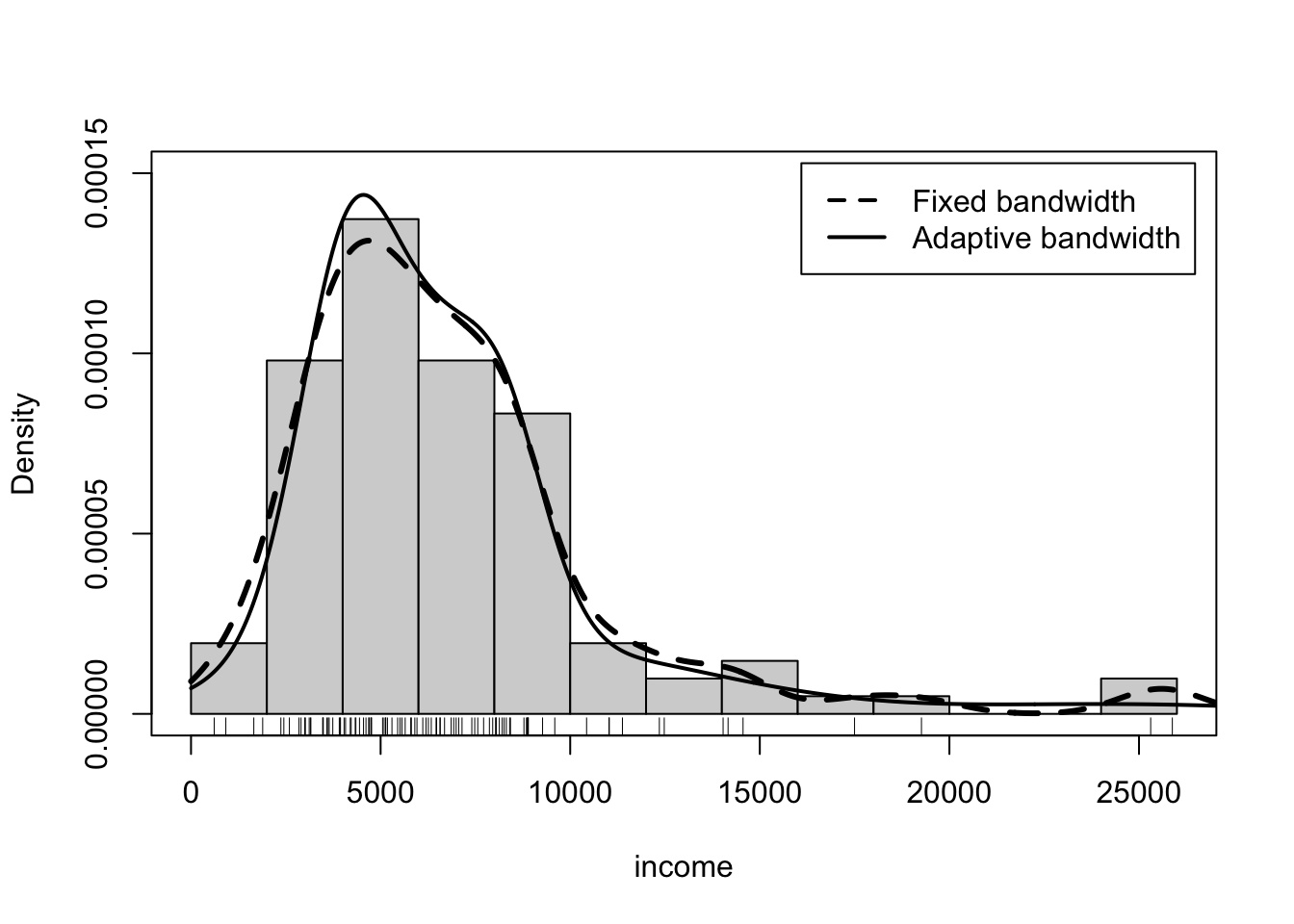 from = 0to bothdensity()andadaptiveKernel()ensures that the density estimates don’t go below income = 0. - The call to