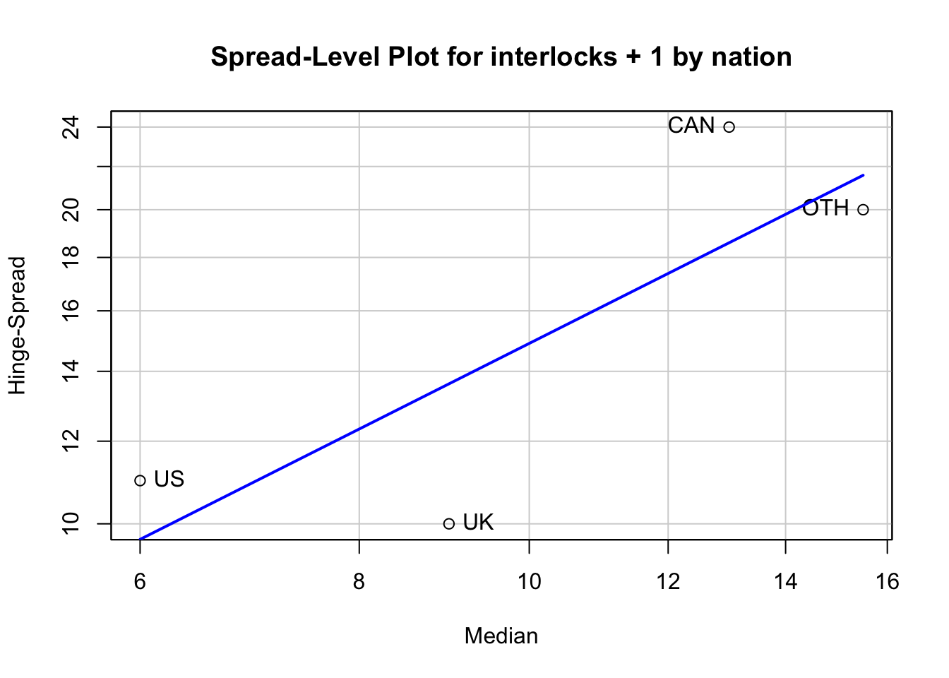 car::spreadLevelPlot()function prints a table showing the first quartile (Tukey’s lower hinge), median, third quartile (upper hinge), and interquartile range (hinge spread ) in each group, along with the suggested power transformation of interlocks + 1.