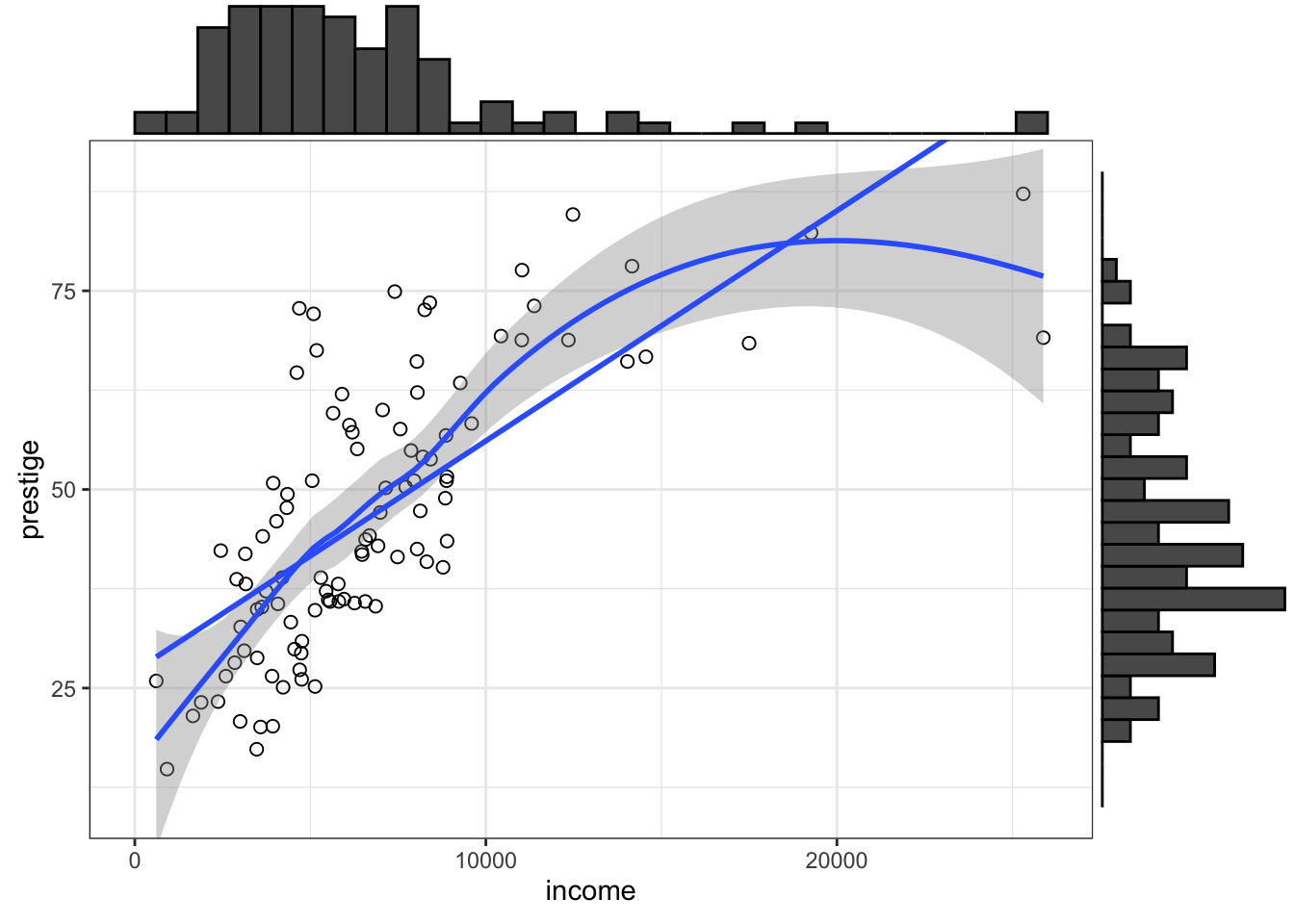 income in the Prestige data set; a density histogram of income is also shown. The rug-plot at the bottom of the graph shows the location of the income values.