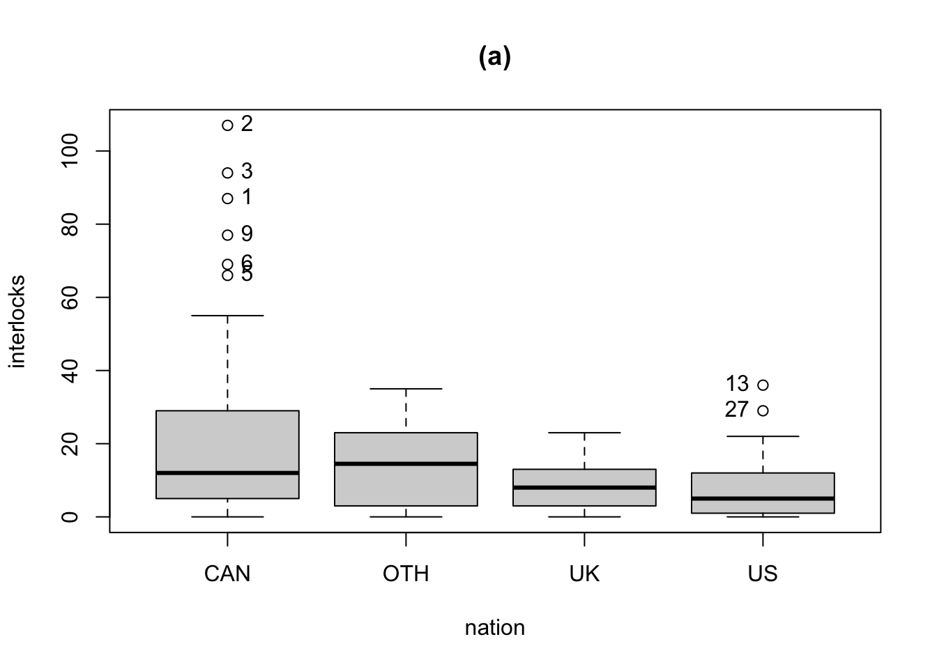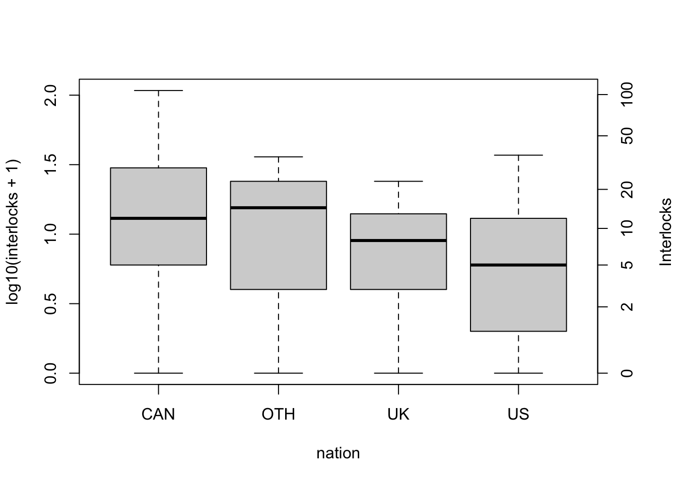 car::Boxplot():- a formula with the base-10 logarithm of interlocks + 1 on the left-hand side and the factor nation on the right-hand side, and