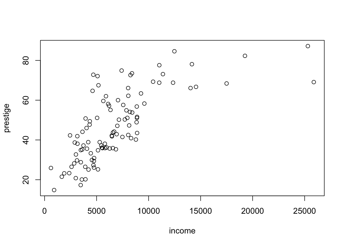 with(carData::Freedman, plot(density, crime)). This command produces the graphic in the RStudio “Plots” tab. - Enter at the console the command for