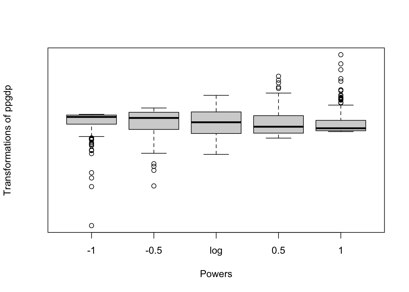 The graphic shows that the ubiquitous log transformation of ppgdp does the best job of making the distribution of the variable symmetric.
