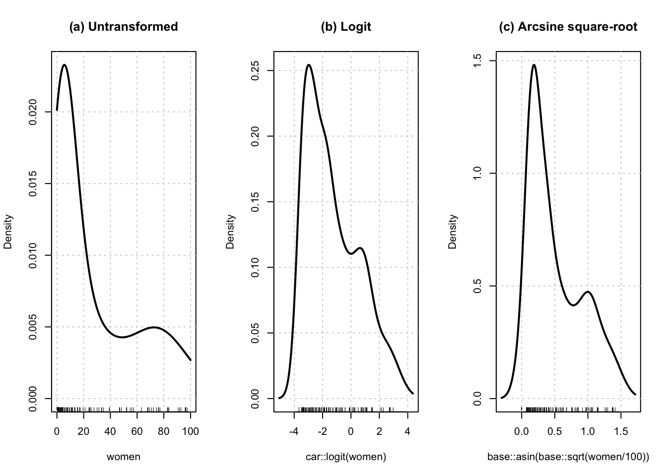 To illustrate, we apply the logit and arcsine-square-root transformations to the distribution of the gender composition of occupations (percentage women) in the Prestige data set: See: Listing / Output 3.61.