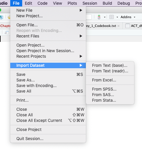 In RStudio there are several options to import data files via the menu available. I generally prefer .csv files using the option From Text (readr). readr is a package included in tidyverse.
