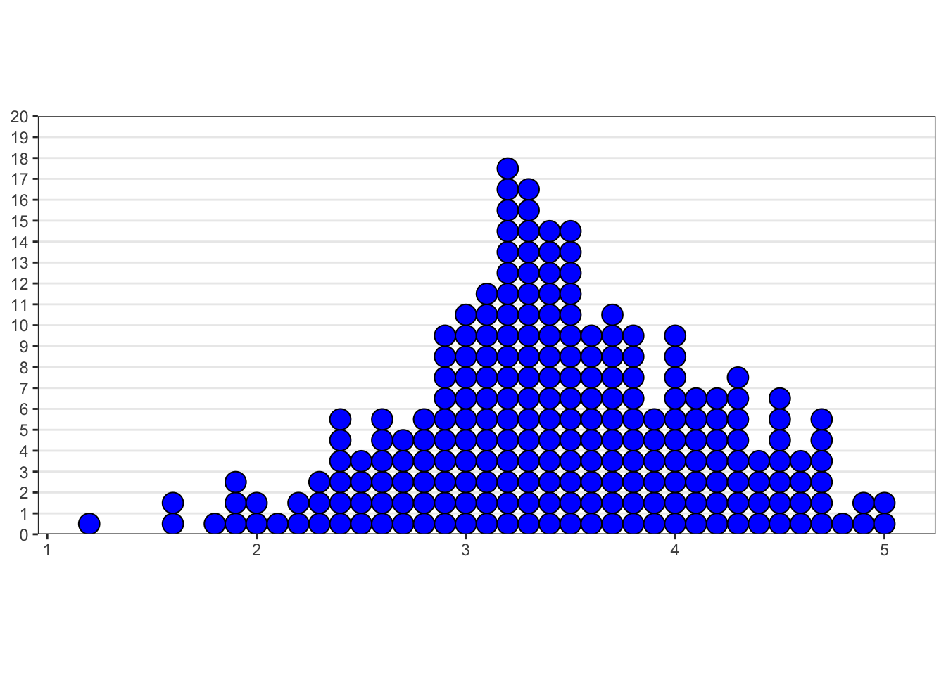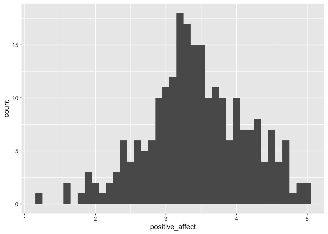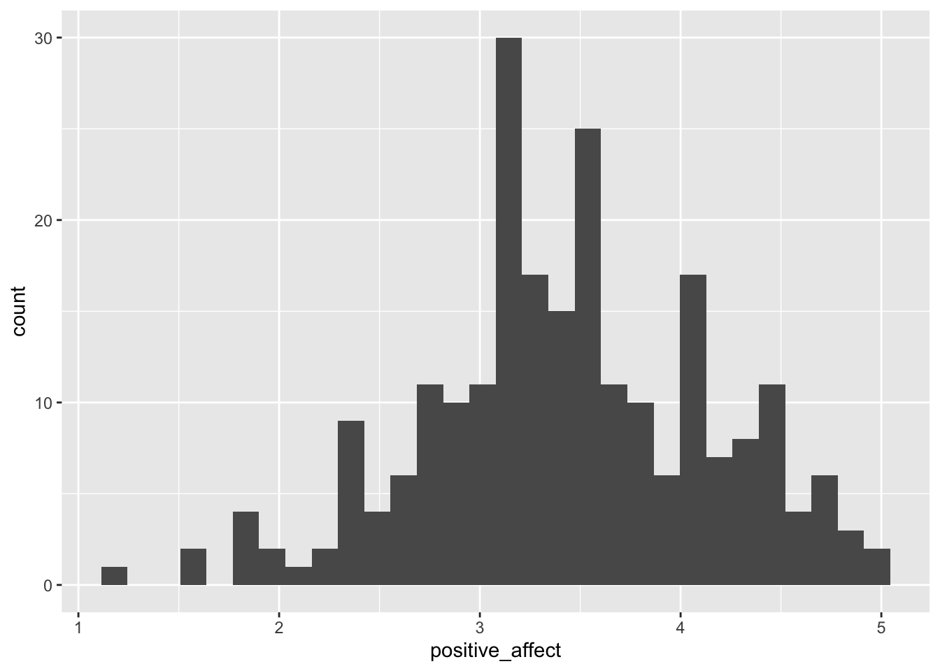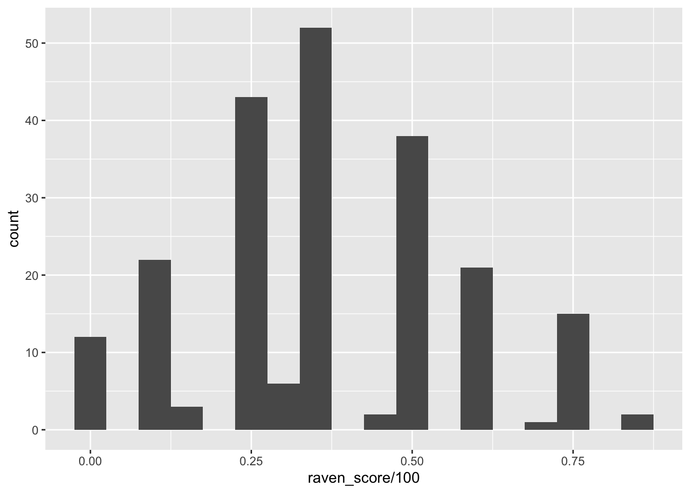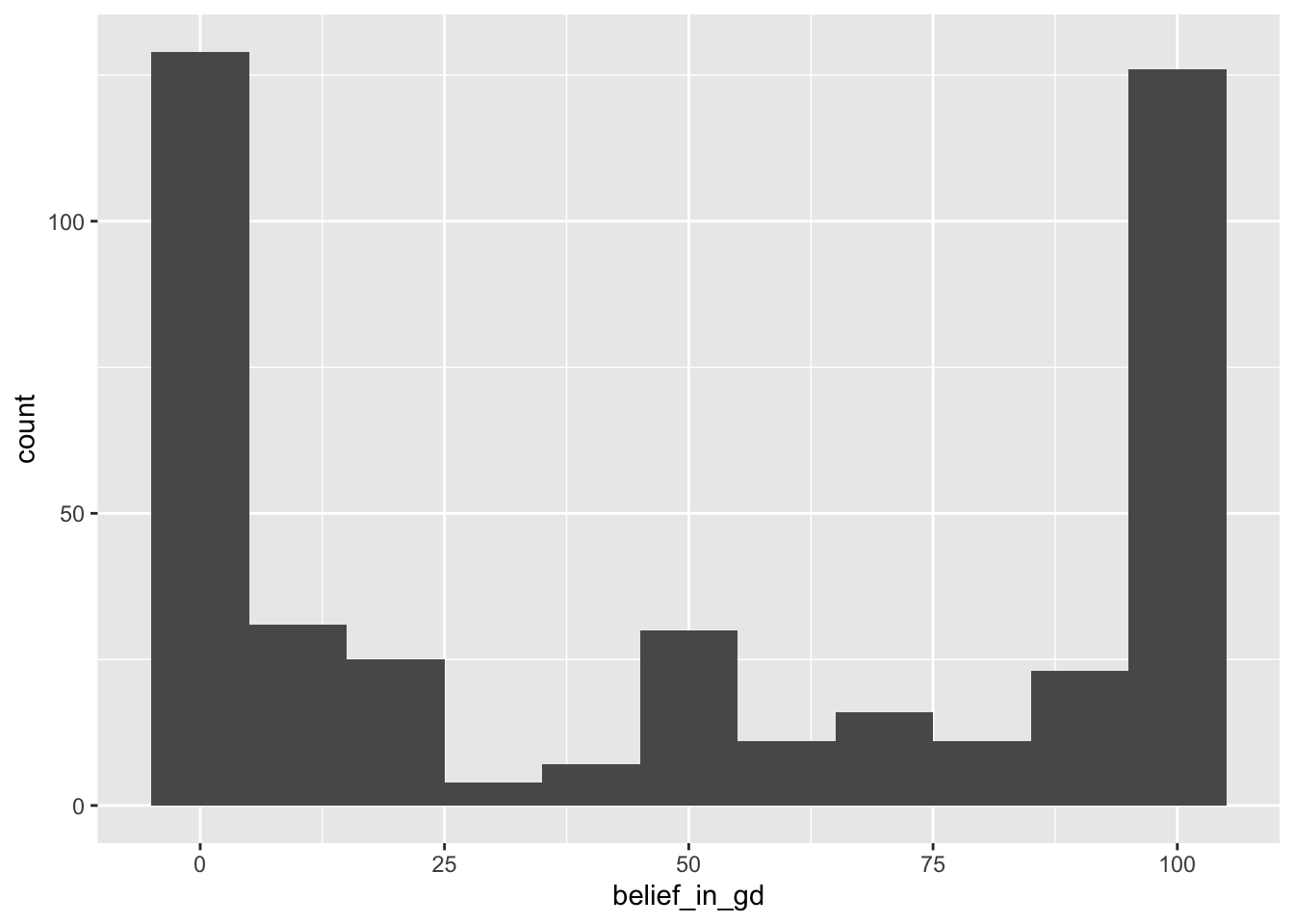 The distribution is clearly bimodal: Most respondents answered 100 (strongly believe in God) or 0 (strongly disbelieve in God), and relatively few participants gave scores between the extremes. My prediction was quite wrong. This is a good illustration of multiple peaks (two in this case) indicating distinct groups of participants.