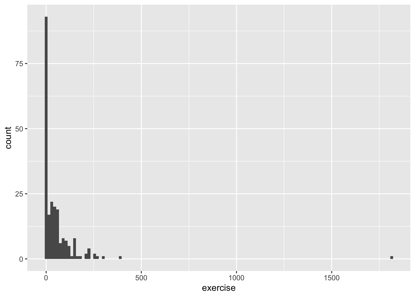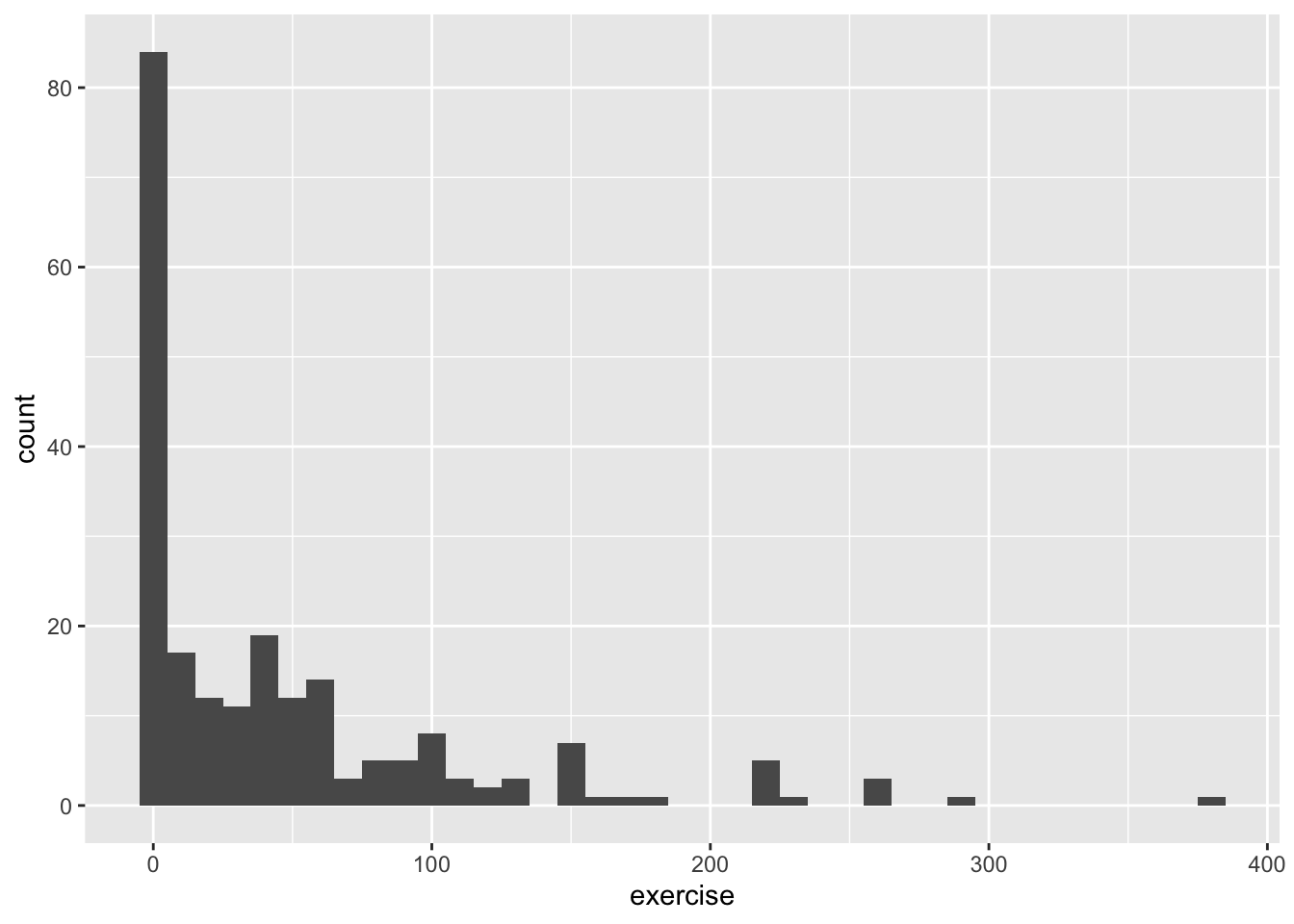 With the Exercise variable we cannot use the above ggplot2 commands to display the histogram. Try it out and you will get the following error message: