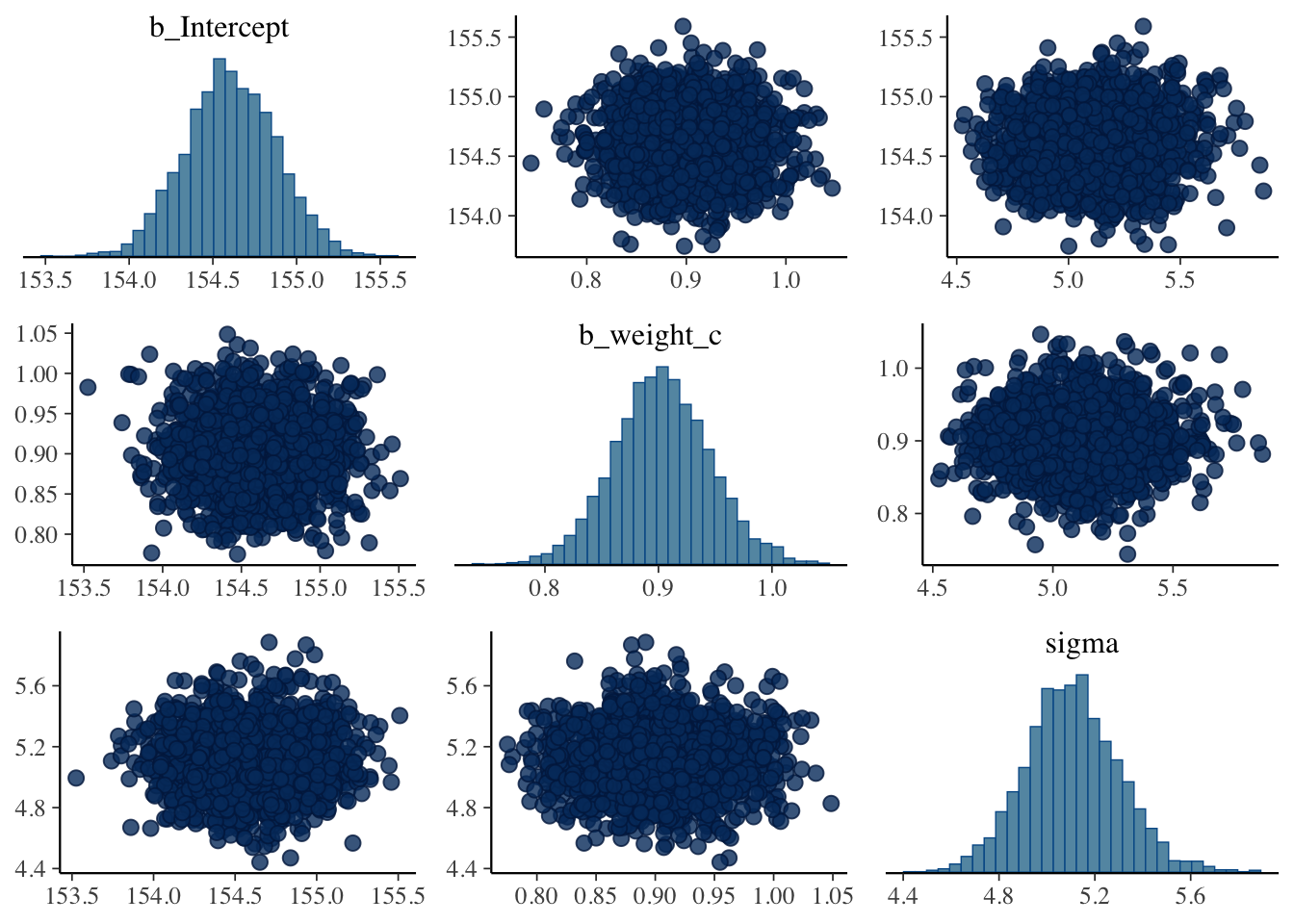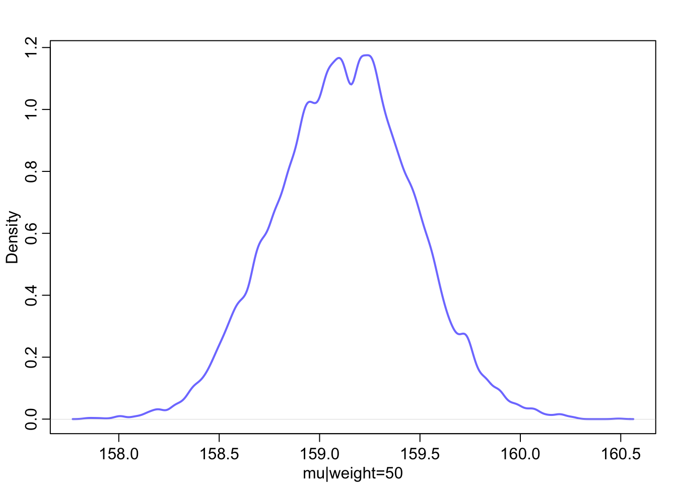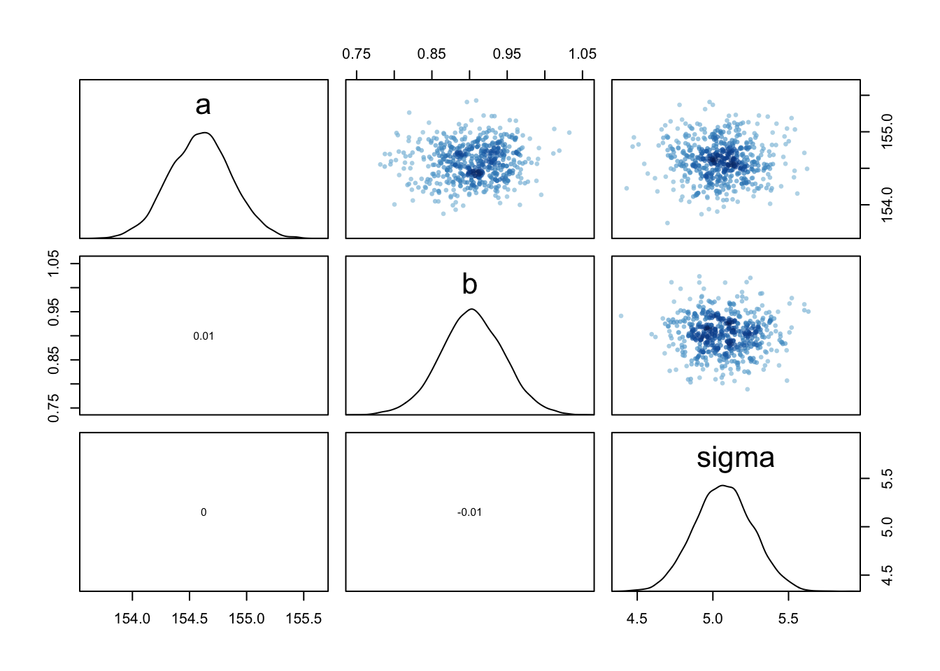 In contrast to the vcov() values of the centered weight version in Example 4.20 we have now big covariances. But the posterior predictions of both models (centered and uncentered version) are nearly the same. Compare with Graph 4.30 (Original) and Graph 4.32 (Tidyverse).